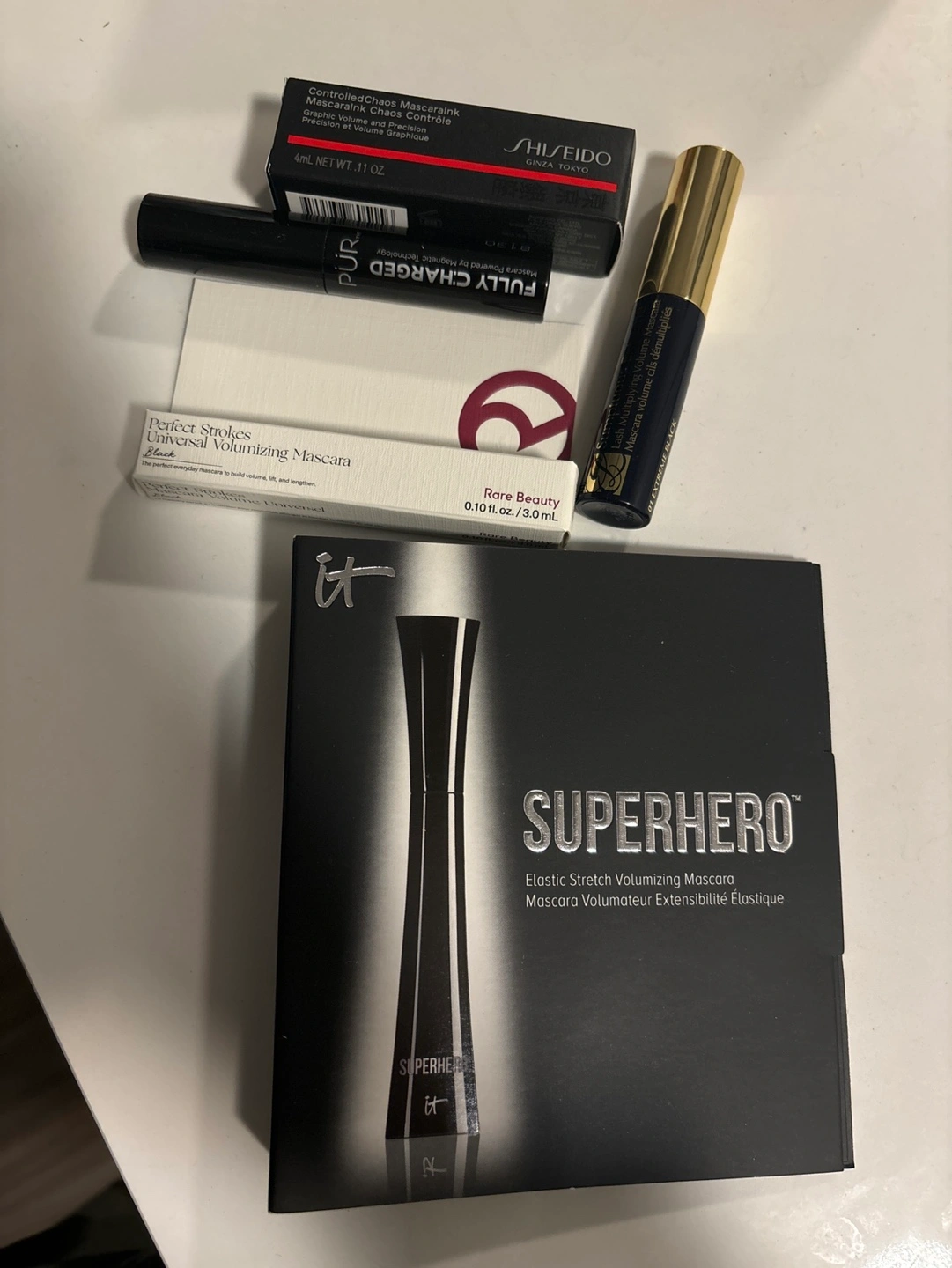 Set of five mascaras. Includes IT Cosmetics Superhero Elastic Stretch Volumizing Mascara, Shiseido Controlled Chaos Mascara/ink, PUR Fully Charged Mascara, and Rare Beauty Sumptuous Extreme Lash Multiplying Volume Mascara. All brand new never opened tubes. See images for details.