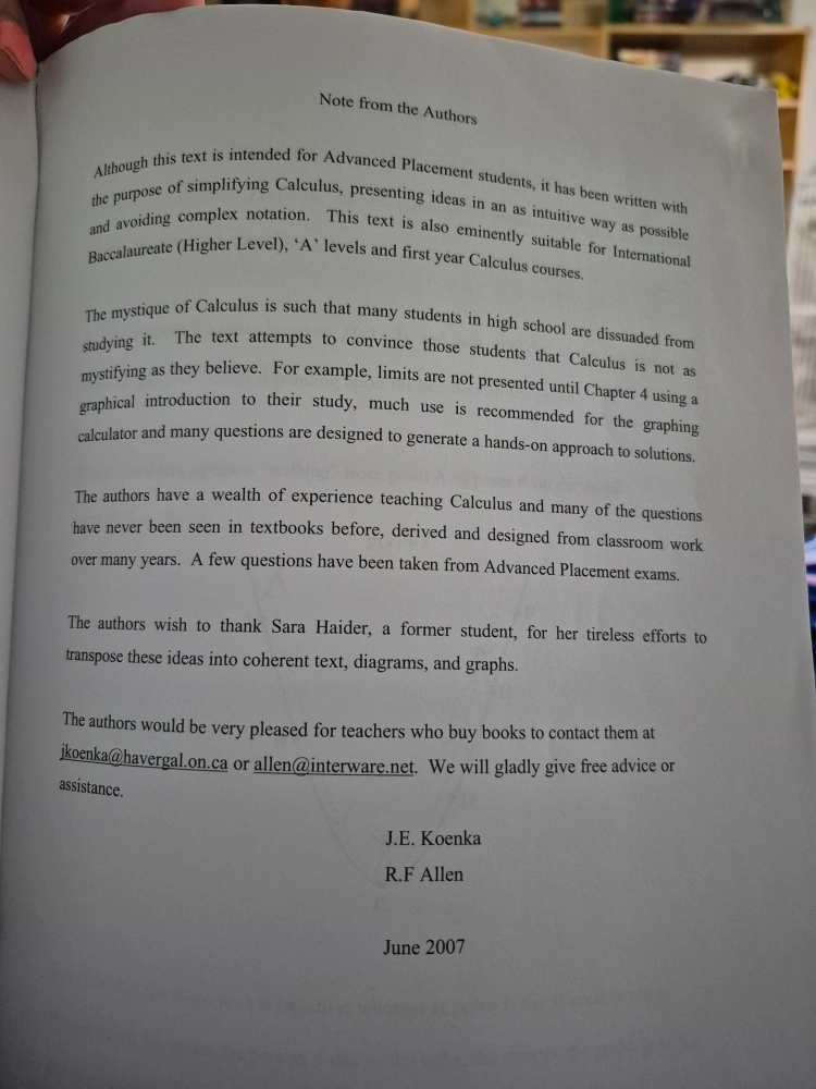 Used Advanced Placement Calculus textbook. Authors J.E. Koenka and R.F. Allen. June 2007 edition. Good for high school students. Includes a note from the authors.
