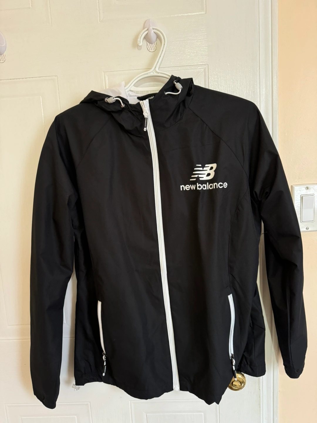 New Balance women's jacket. Black with white accents. Full zip closure. Hood. Size Medium. Made in Vietnam.