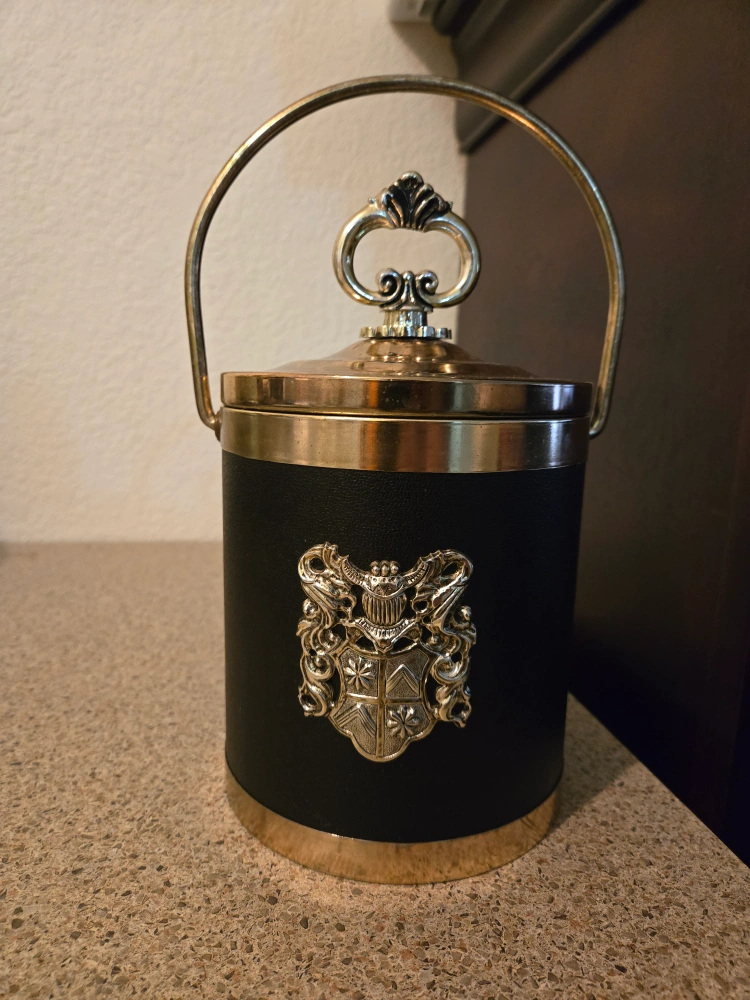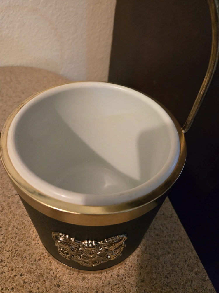 Black and gold ice bucket. Features a decorative crest. Includes a lid and a carrying handle. Excellent for entertaining.