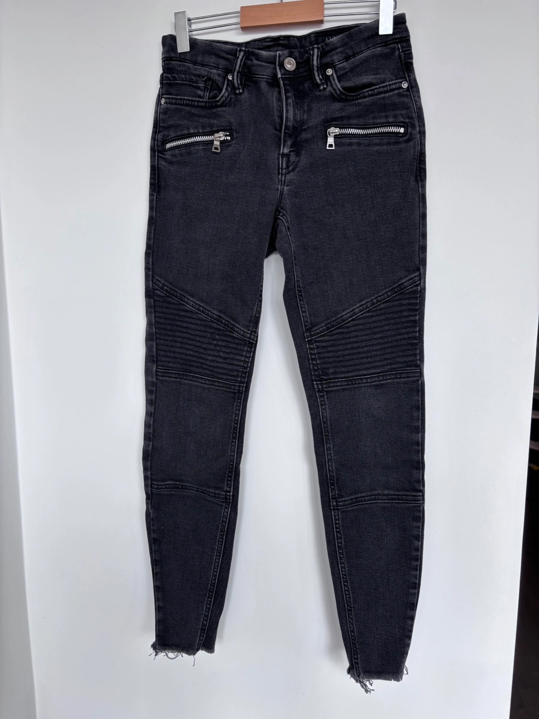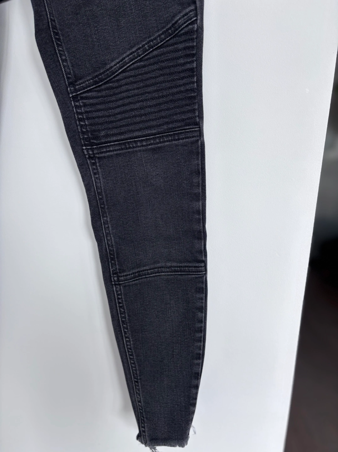 Women's dark grey moto jeans. Zipper detailing. Raw hem. Slim fit.