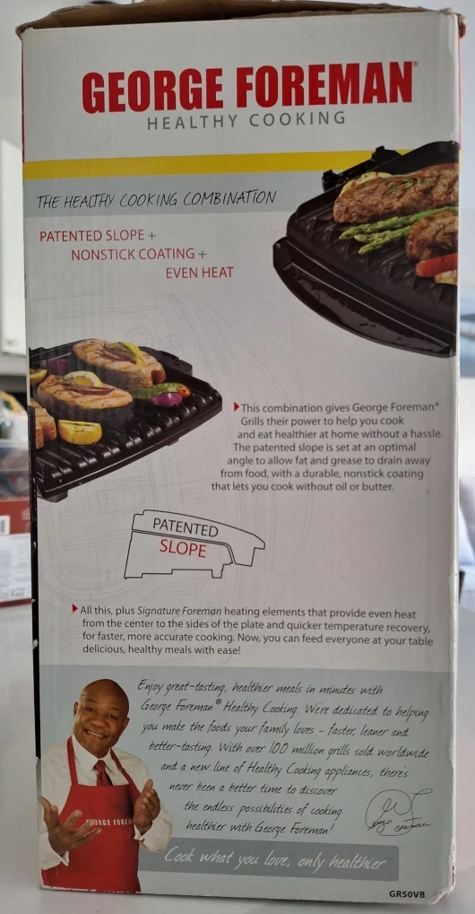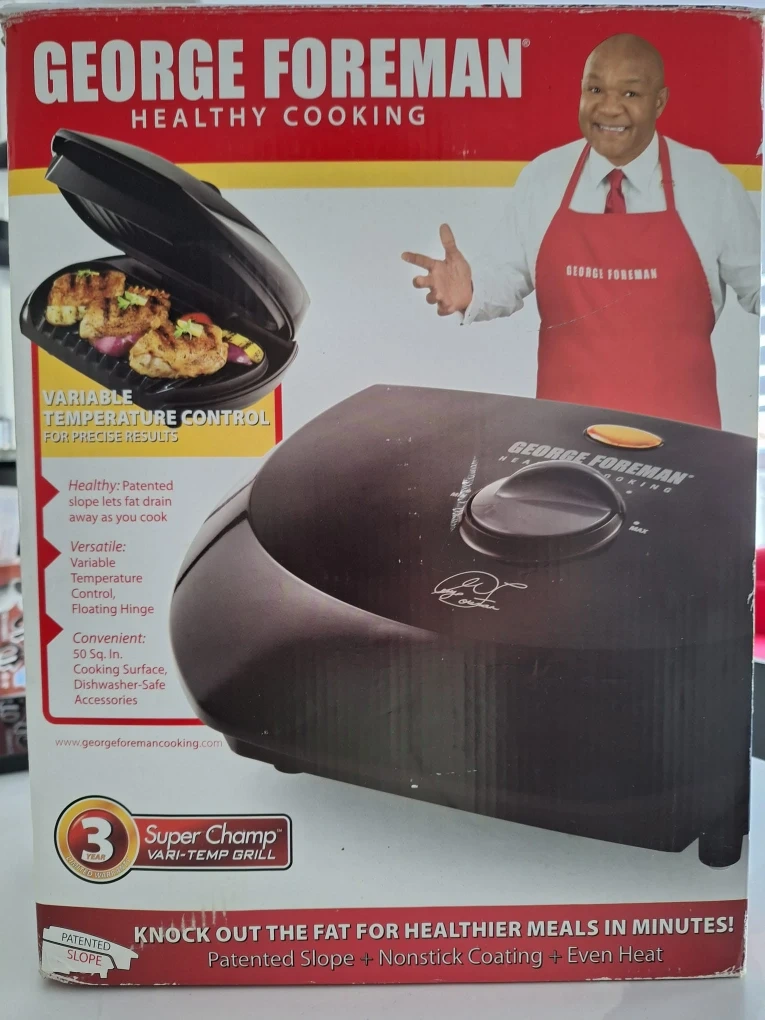 George Foreman 50 sq. Inch Super Champ Vari-Temp Grill. New, never used. Box is a bit damaged due to storage.