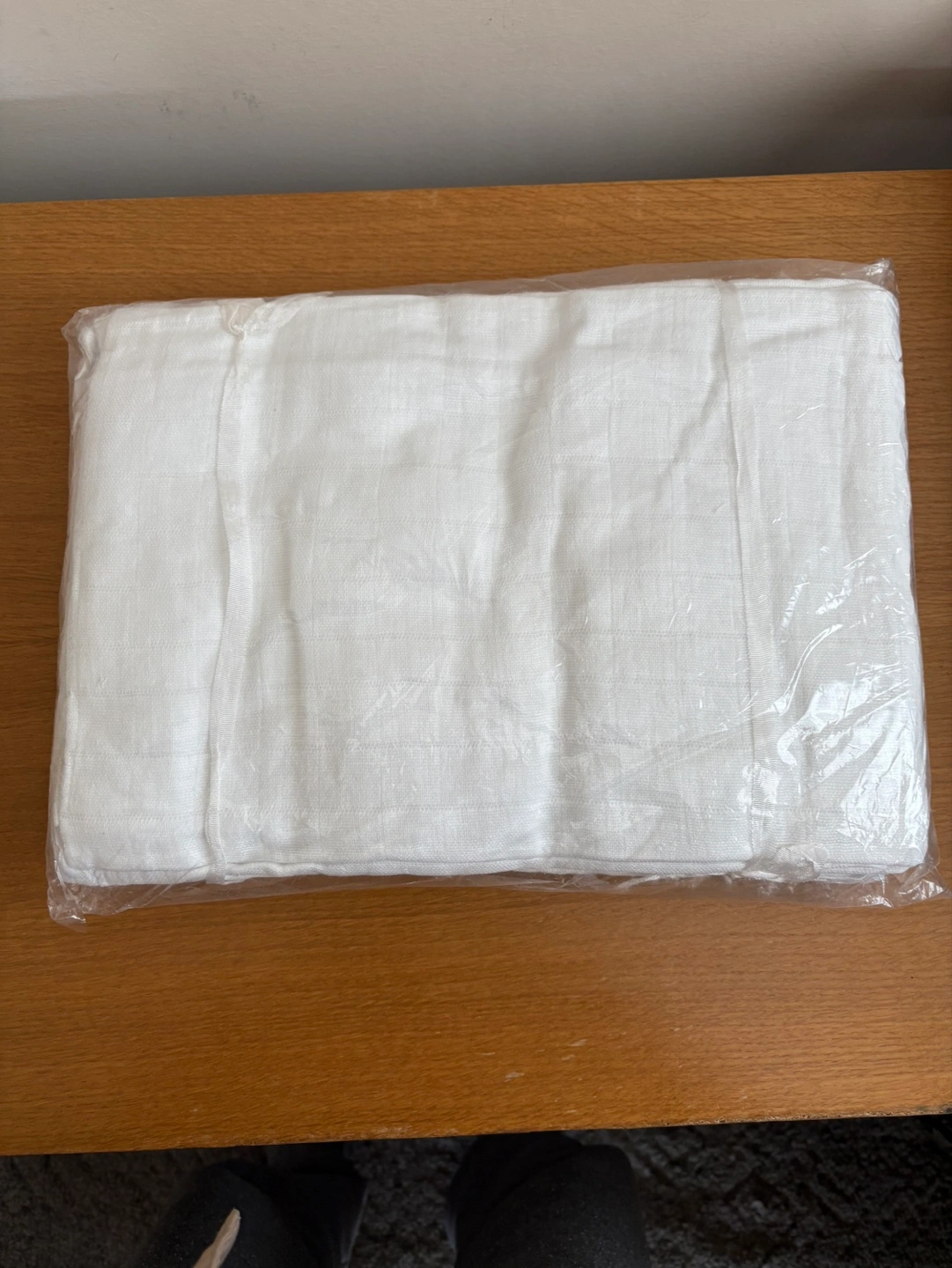 White baby cloth diapers 28” x 28”. Soft, absorbent and environmentally friendly. Pack of 10. New and unused. Health brand. Can provide instructions how to fold.
