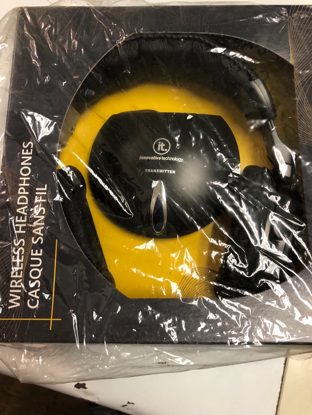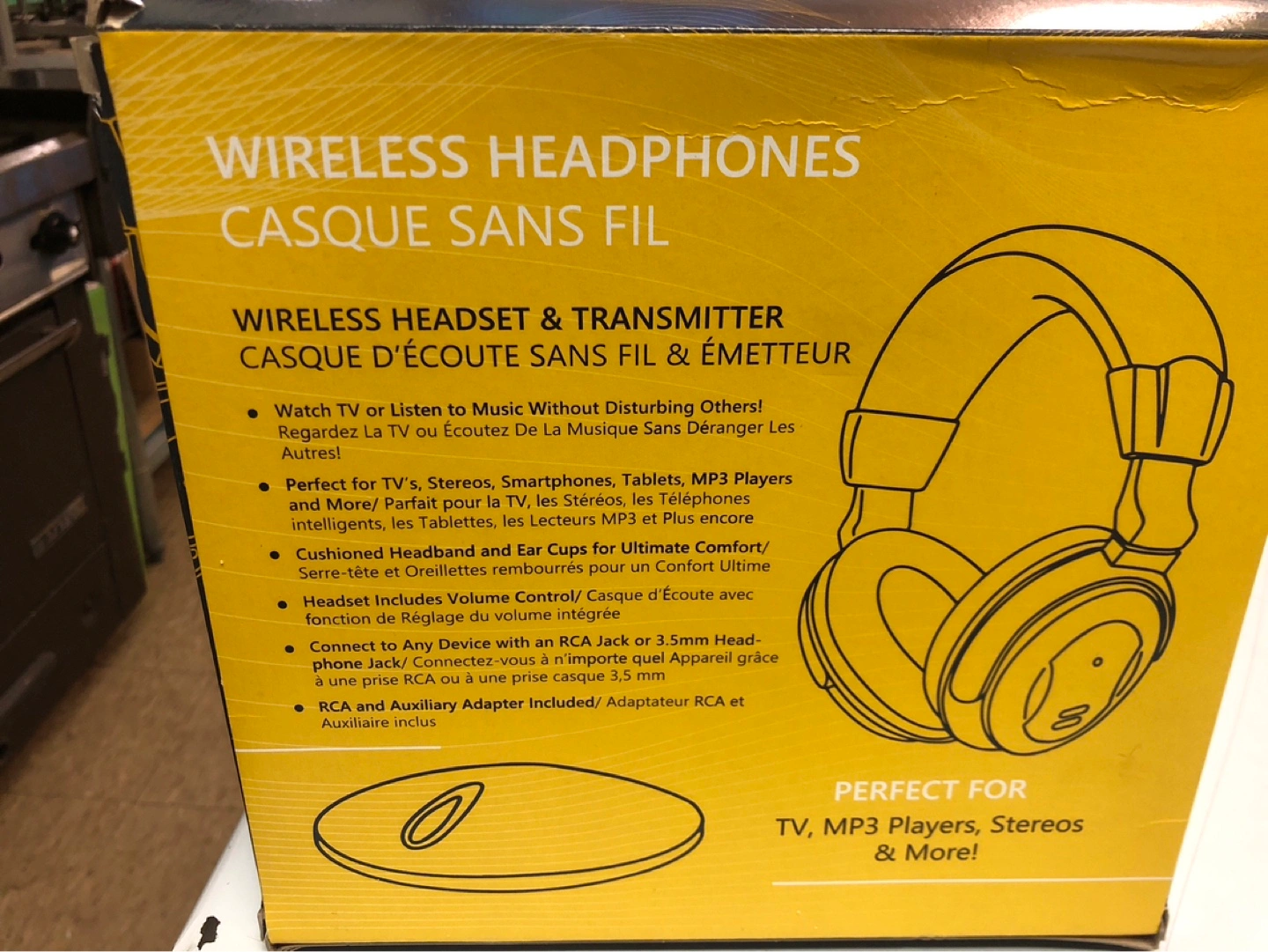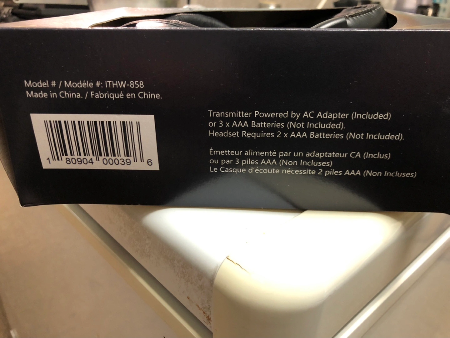 78Wireless headset and transmitter. Perfect for TVs, smartphones, tablets, MP3 players and more. Cushioned headband and ear cups for ultimate comfort. Volume control. Connects via 3.5mm headphone jack, RCA audio out jack and aux. Includes AC adapter. Requires 2 AAA batteries (not included). Transmitter powered by AC adapter or 3 AAA batteries (not included). Model # ITHW-858.
