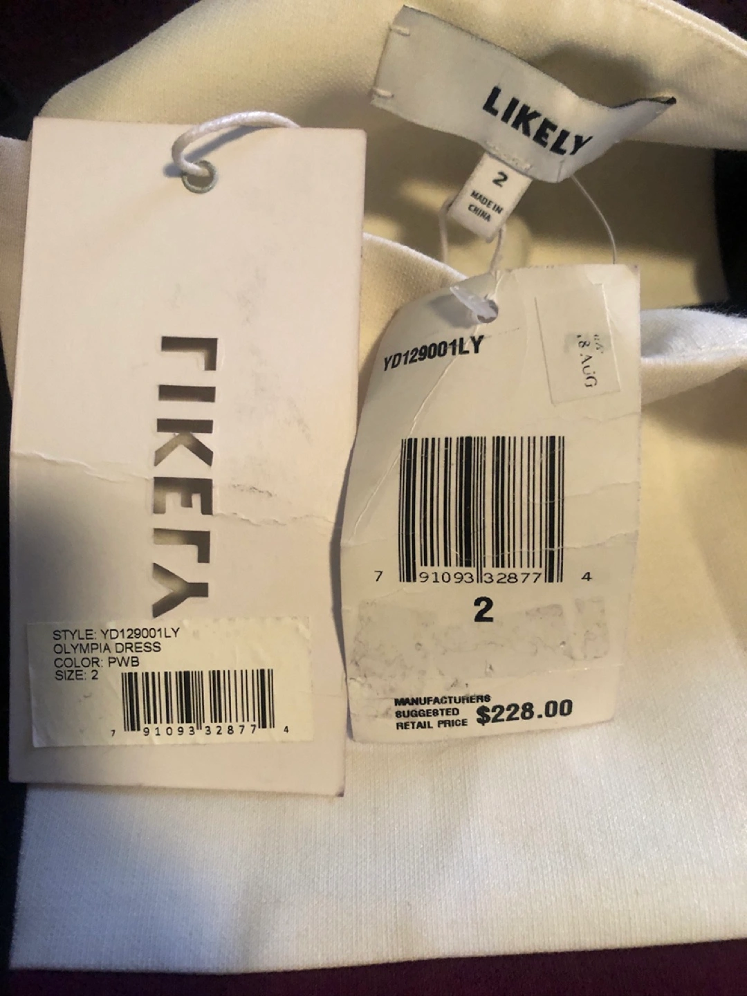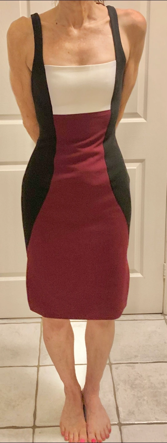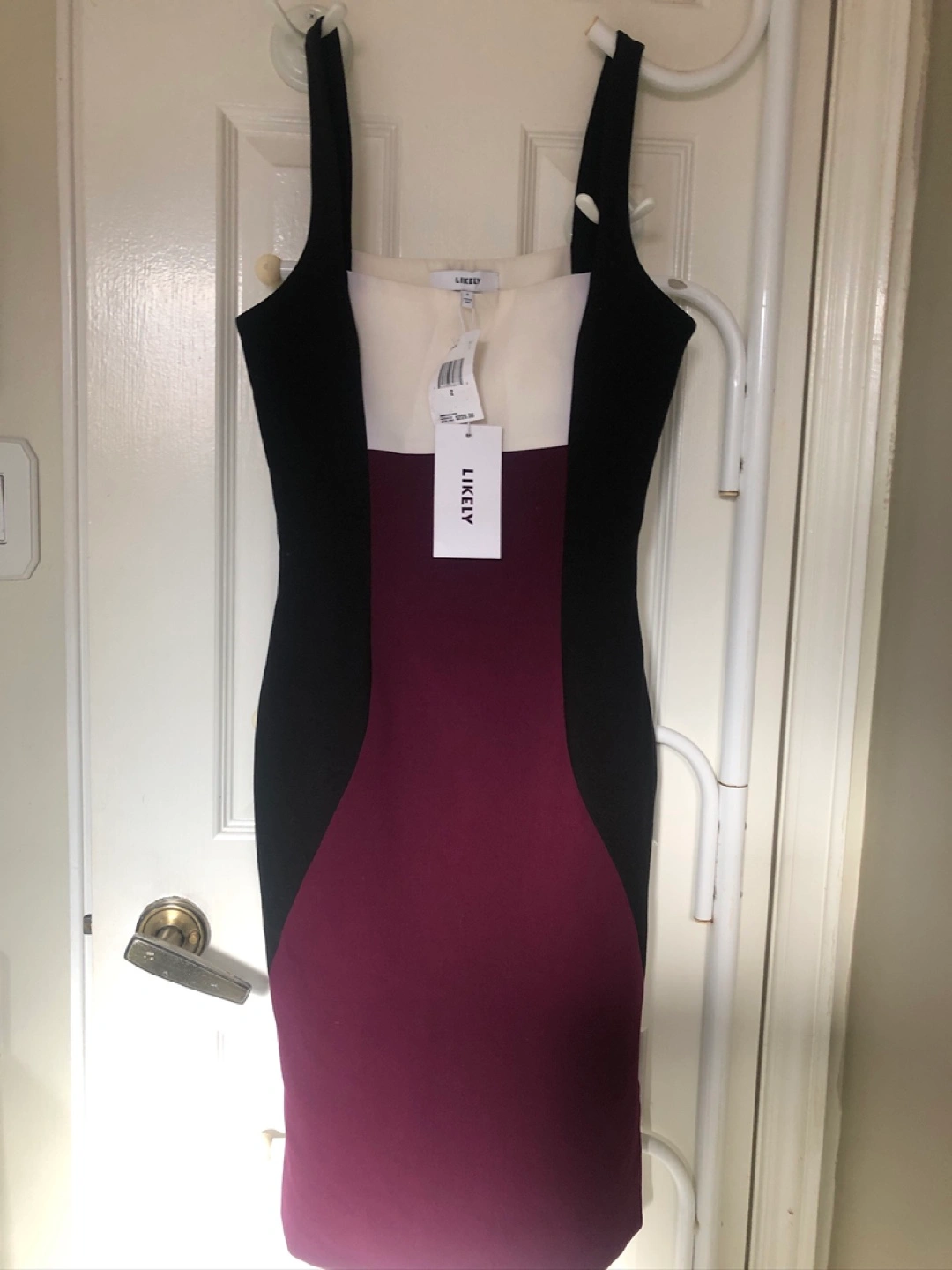 Woman’s dress by Likely (bnwt) Stunning cocktail dress Features a color blocked design in black, white, and burgundy. Midi length just above the knee with side slits as seen in picture fitted silhouette.