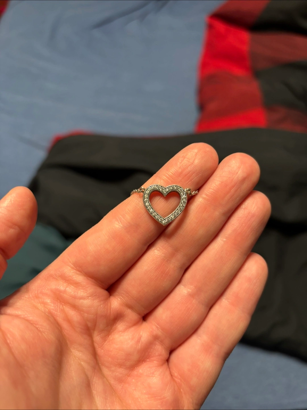Delicate silver chain necklace. Features a hollow heart pendant encrusted with tiny clear stones. Simple and elegant design.