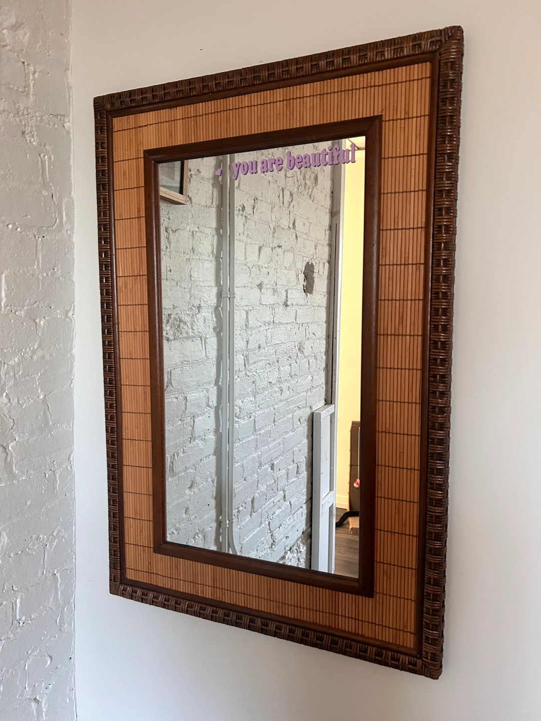 Rectangular mirror, bamboo frame. Features a decorative "you are beautiful" decal. Great for a vintage or boho aesthetic.