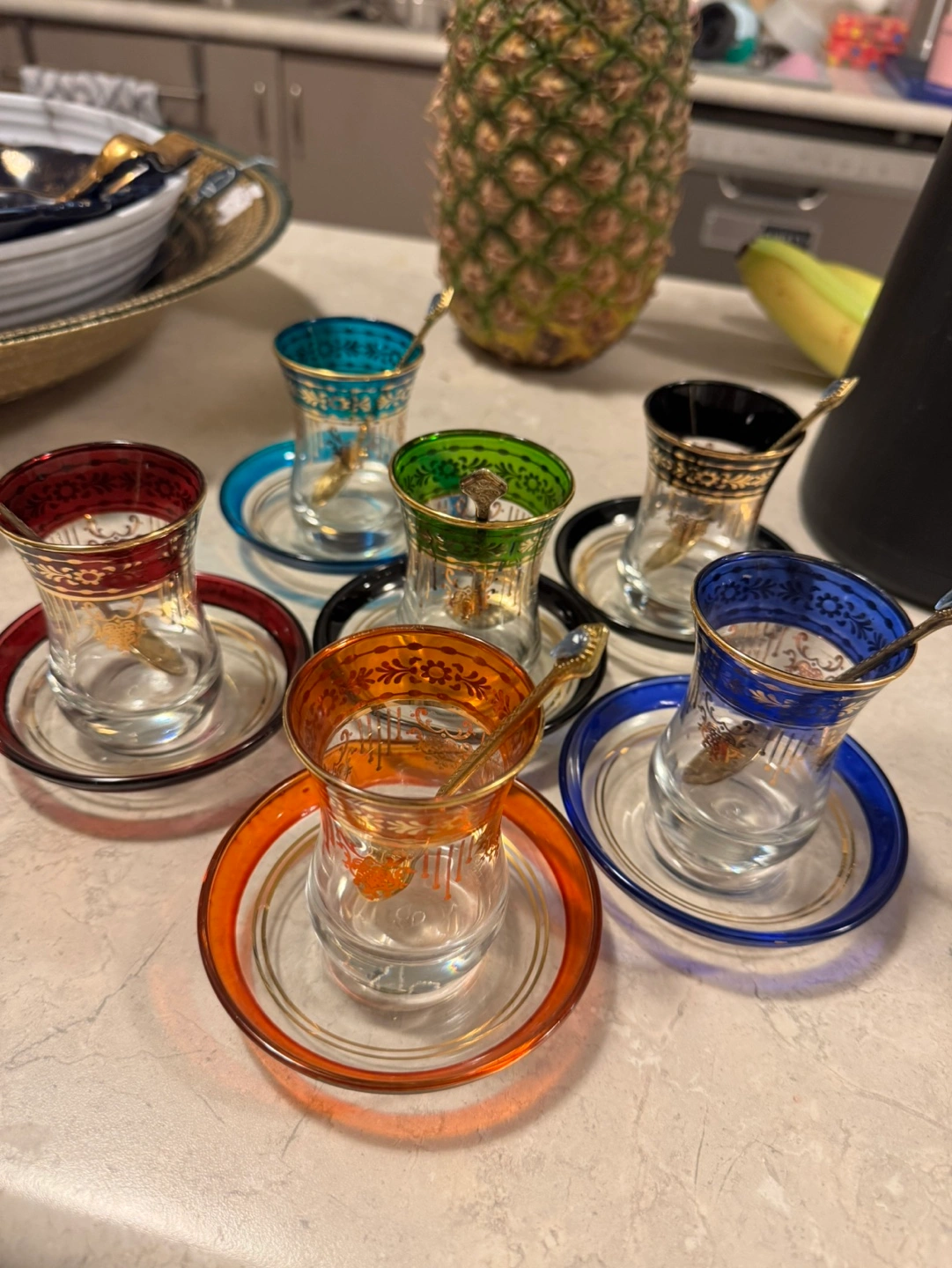 Six colourful glass teacups, each with a matching saucer and small spoon. Gold detailing on each piece. Perfect for serving Turkish tea or other beverages.