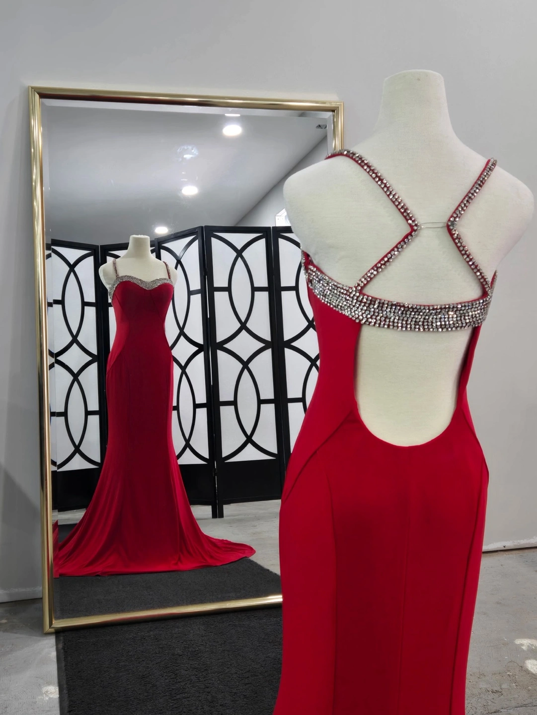 Gorgeous red floor-length gown. Features a jewel neckline and a criss-cross back detail with sparkling embellishments. Fitted silhouette. Perfect for prom, a wedding, or other formal event.