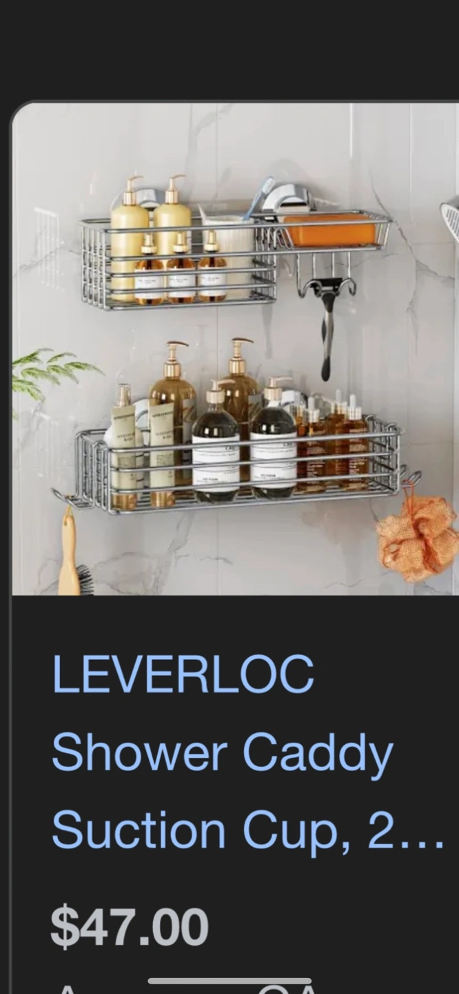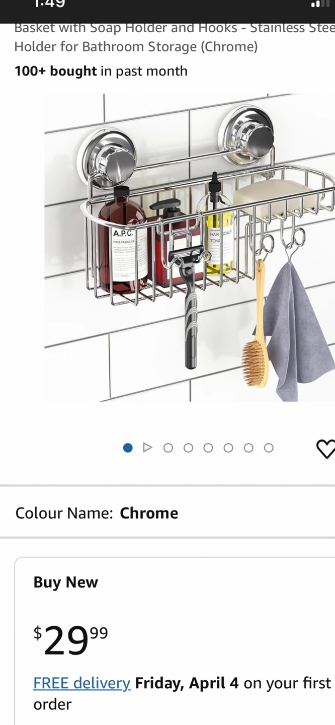 Stainless steel shower caddy. Two suction cups for easy installation. Features a soap holder and hooks for storage. Great for bathroom organization.