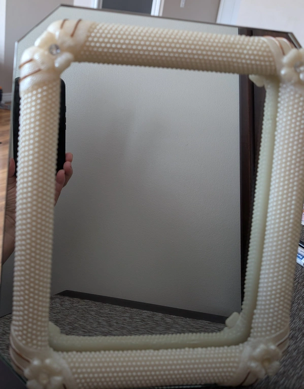 Ornate off-white beaded frame. Features small flower accents. Glass mirror. Free-standing design. Unique vintage piece.
