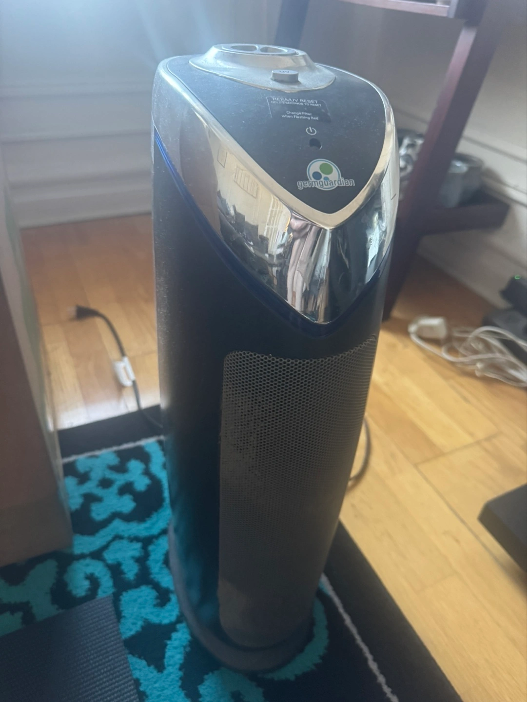 Used Guardian air purifier. Sleek design, tall and slender. Features UV light and multiple fan speeds. Includes power cord. Pre-owned, good condition.