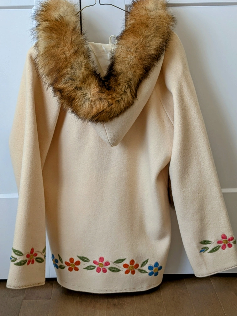 1980s hand embroidered wool anorak, satin interior. Features a fur trimmed hood, colourful floral embroidery, and toggle closures. Made in Canada.