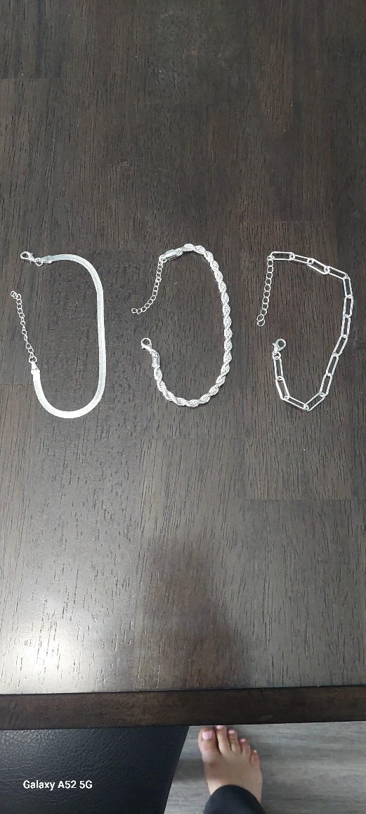 Three delicate silver bracelets. One features a herringbone chain, another a twisted rope design, and the last has a link chain. All have lobster clasps.