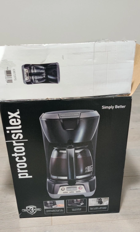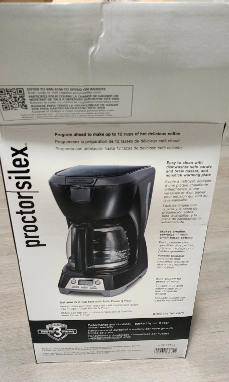 New in box, 12-cup programmable coffee maker. Features auto pause & pour, easy clean, and a 3-year warranty. Simply Better design.