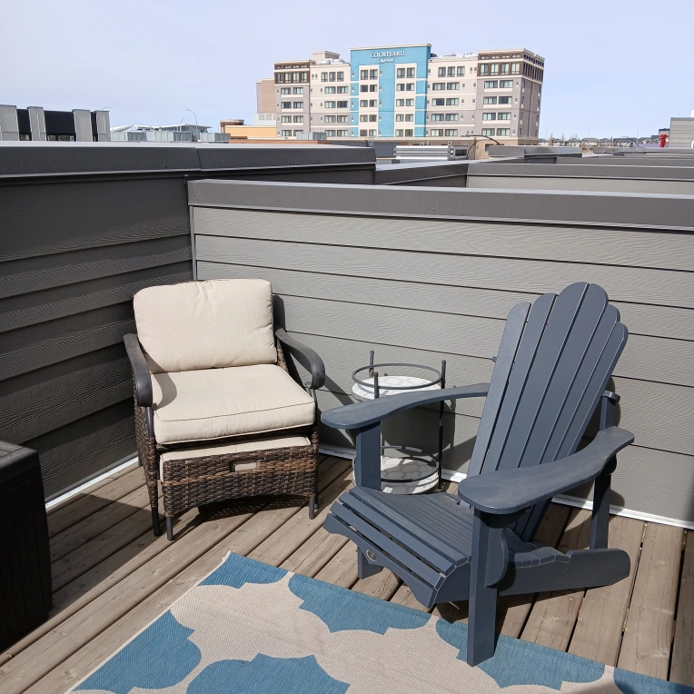 Two-piece patio furniture set. Includes a wicker chair with storage ottoman and a dark grey Adirondack chair. Perfect for relaxing outdoors. Both chairs are in good condition.