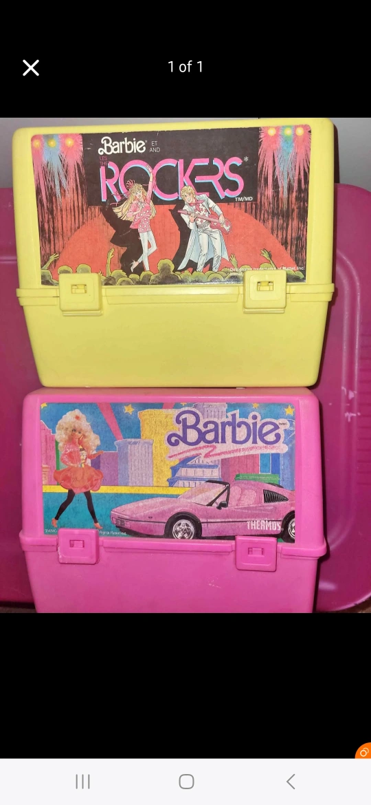 Two vintage Barbie lunchboxes. One features Barbie and the Rockers. The other shows Barbie in a city scene with a sports car. Both are plastic.