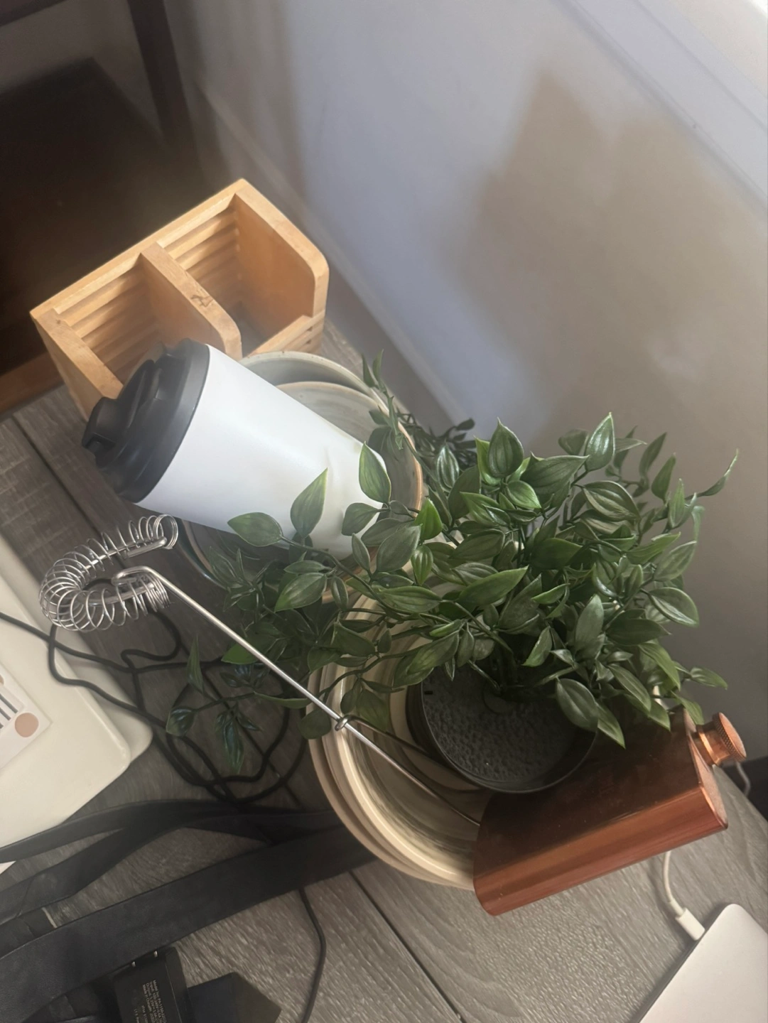 Bundle includes a white coffee tumbler, artificial green plant in a dark gray pot, and a light brown wooden organizer. Also includes a metal whisk frother.