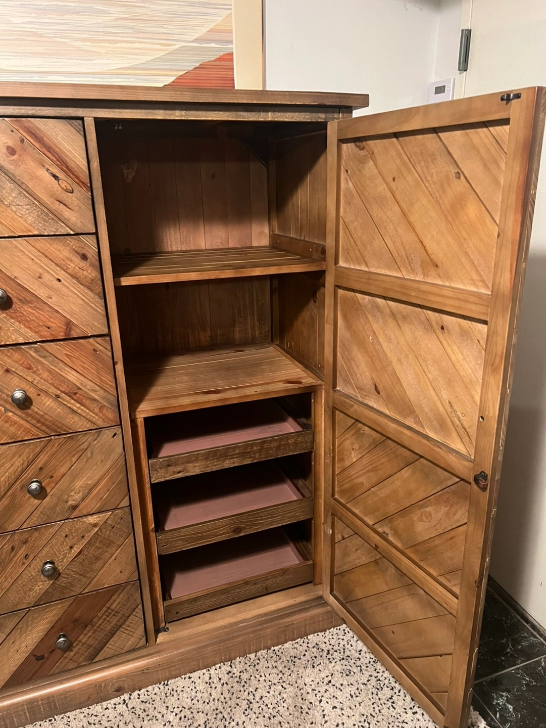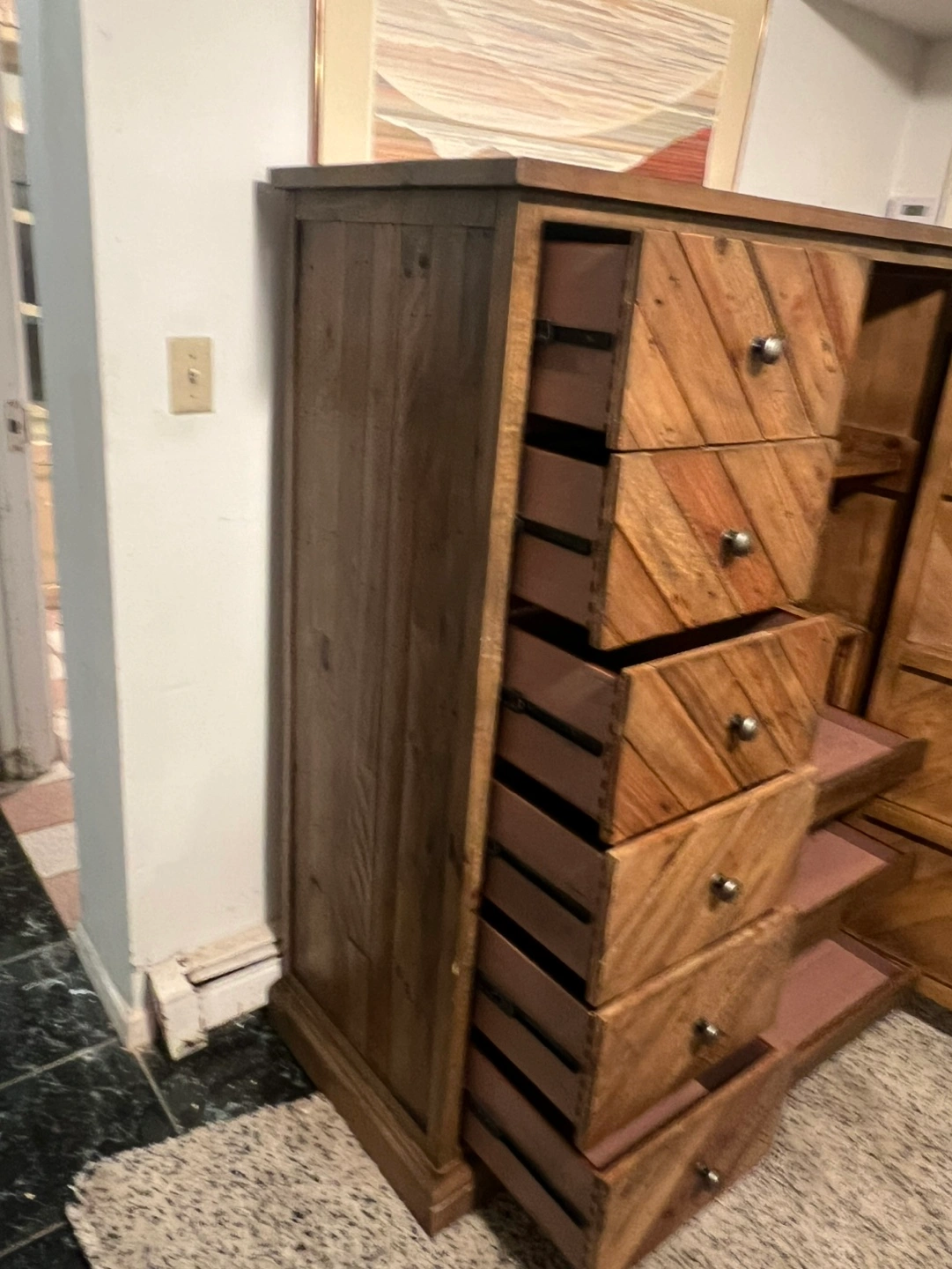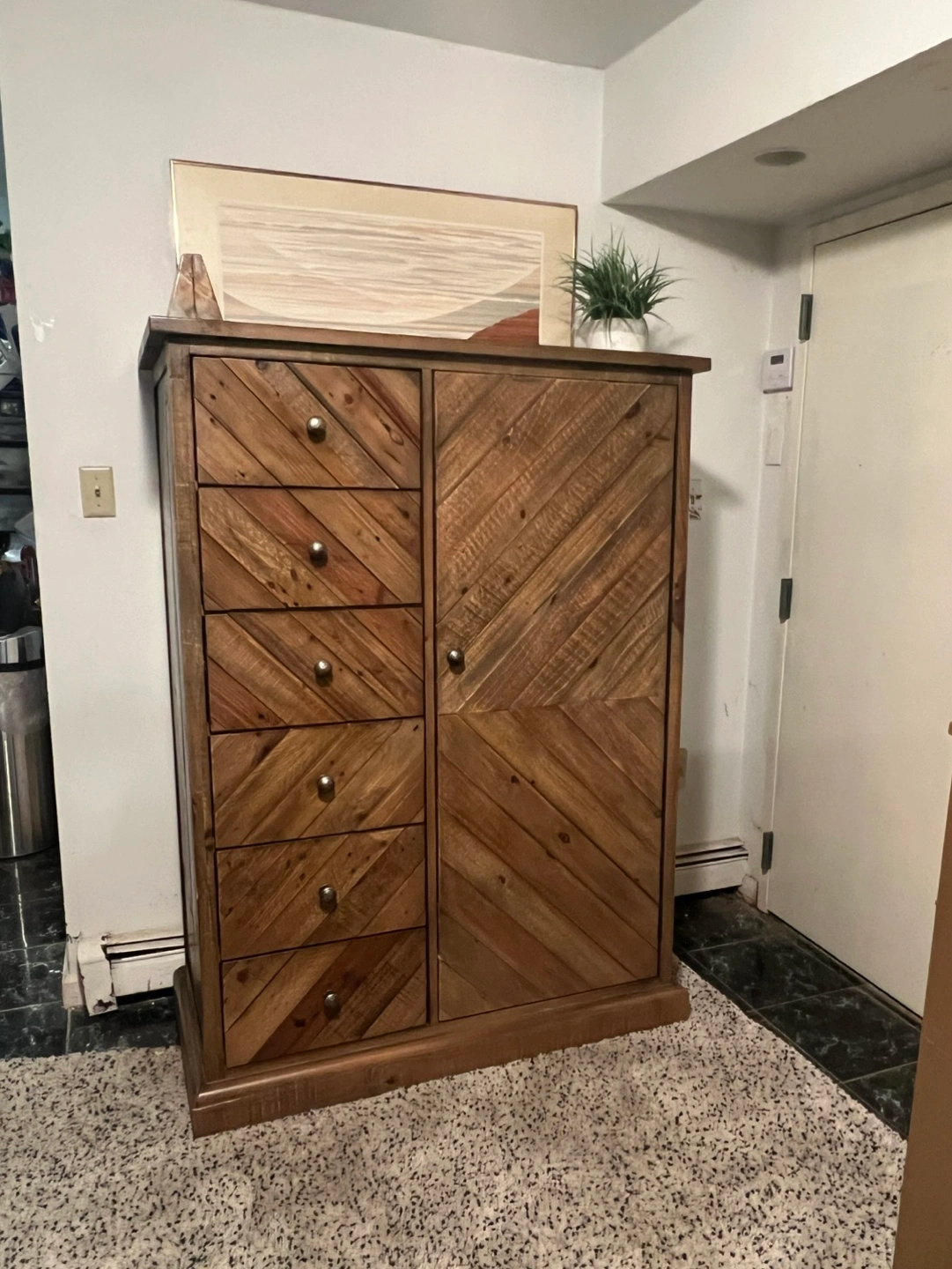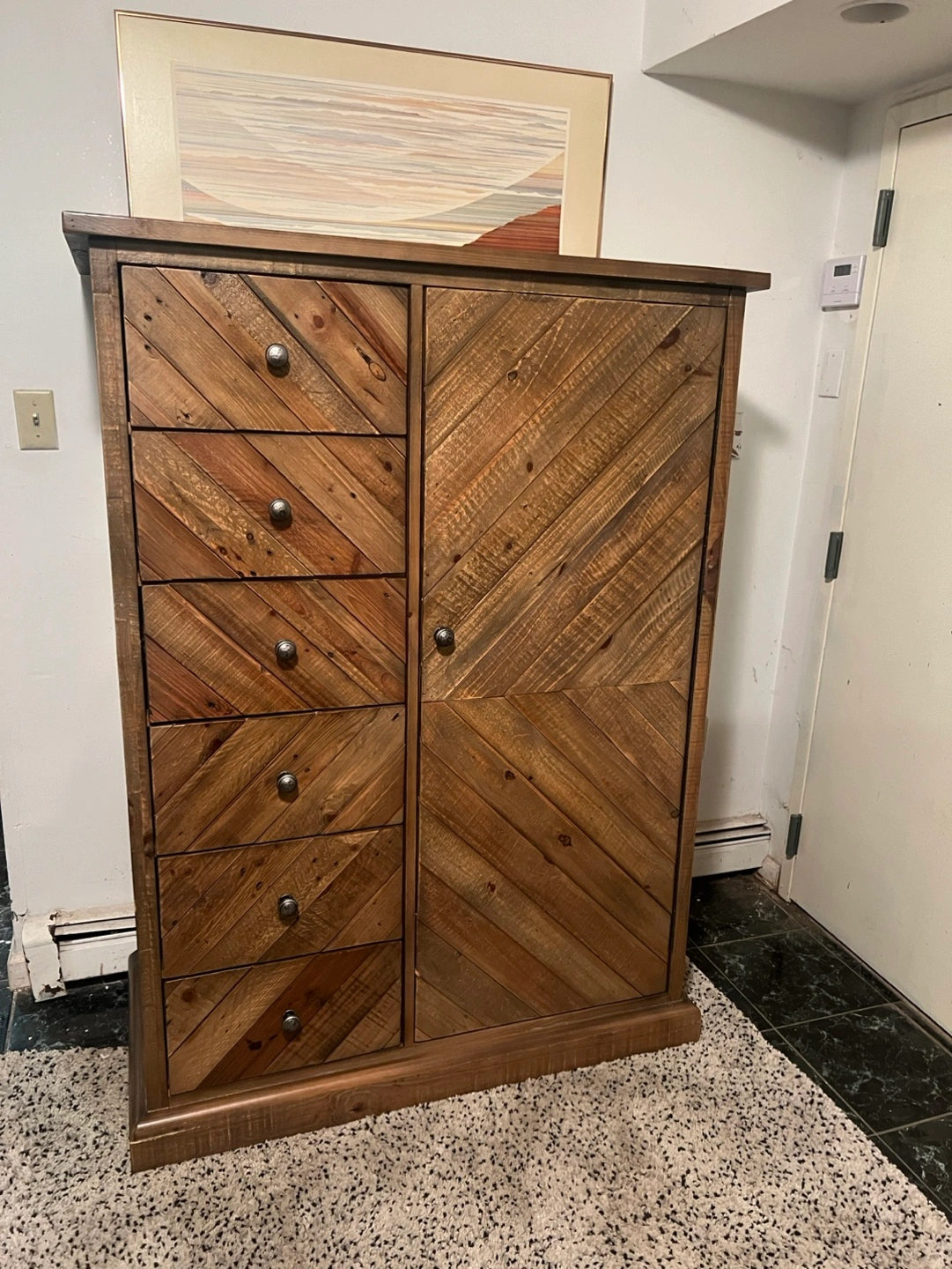 Selling excellent condition door chest of drawers or armoire. Sturdy and built very well. Door and all drawers open and close smoothly. This chest is large, pls pay attention to the measurements. May have some cosmetic wear but no broken parts.