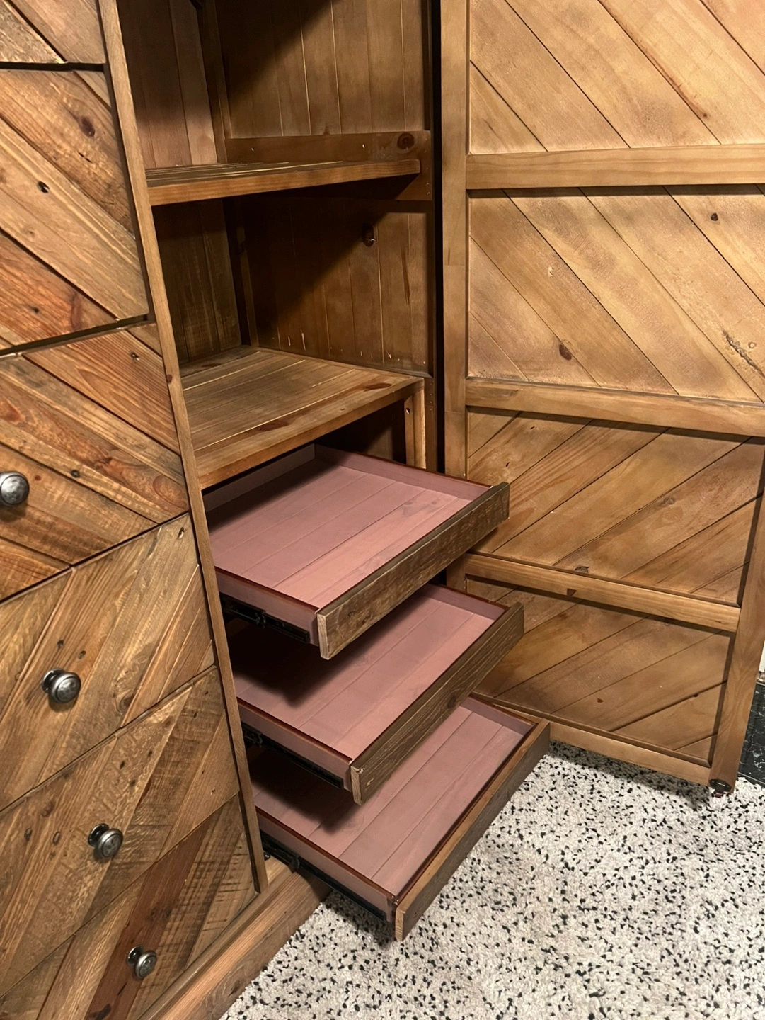2 shallow sliding drawers and 2 shelves behind door