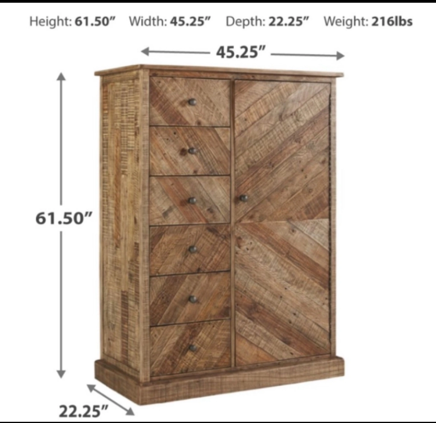 This piece includes best of both rustic and contemporary in the Grindleburg door chest. Loaded with charm and knotty character, this high-quality chest is crafted with reclaimed pine wood treated to a light-weathered finish to enhance its natural grain and tonal variation. Chic chevron planking adds a fashion-forward element and gives this accommodating bedroom chest a sense of flair and refinement.