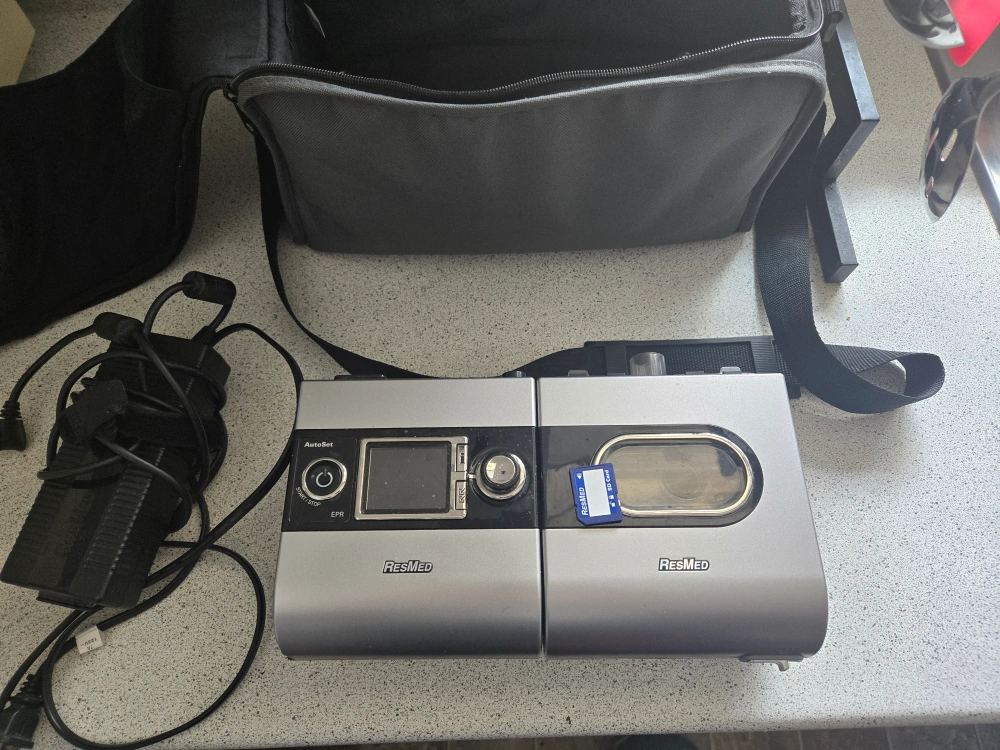 Used ResMed AutoSet CPAP machine. Includes power supply, carrying case, and humidifier. Pre-owned, shows some wear. it's a few years old but works perfectly fine. I don't need it anymore because I've lost a ton of weight and much healthier condition than I was in when I got diagnosed with Sleep Apnea. Asking $200 or best offer. Serious inquiries only please.