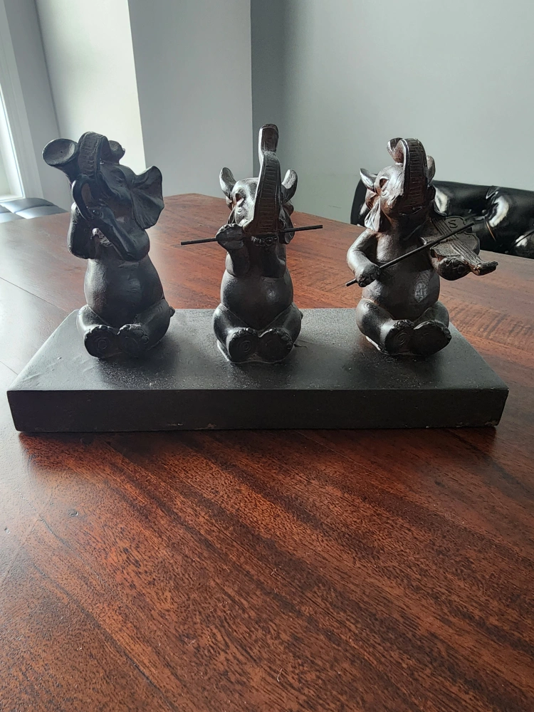 Adorable figurine of three elephants playing musical instruments. Dark brown resin. Sits on a black rectangular base. Collectible item.