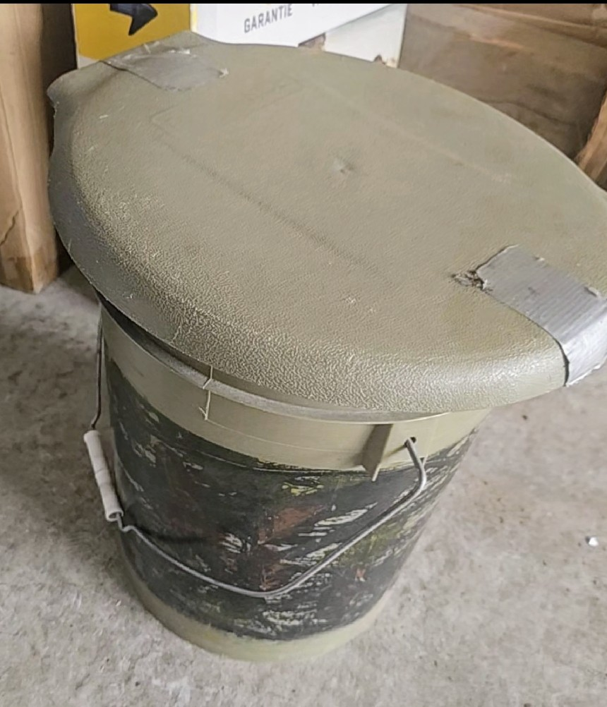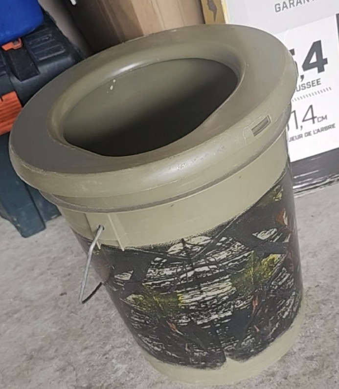 portable toilet bucket camping or in camper. Features a camouflage design and a removable lid. Includes a small carrying handle.
