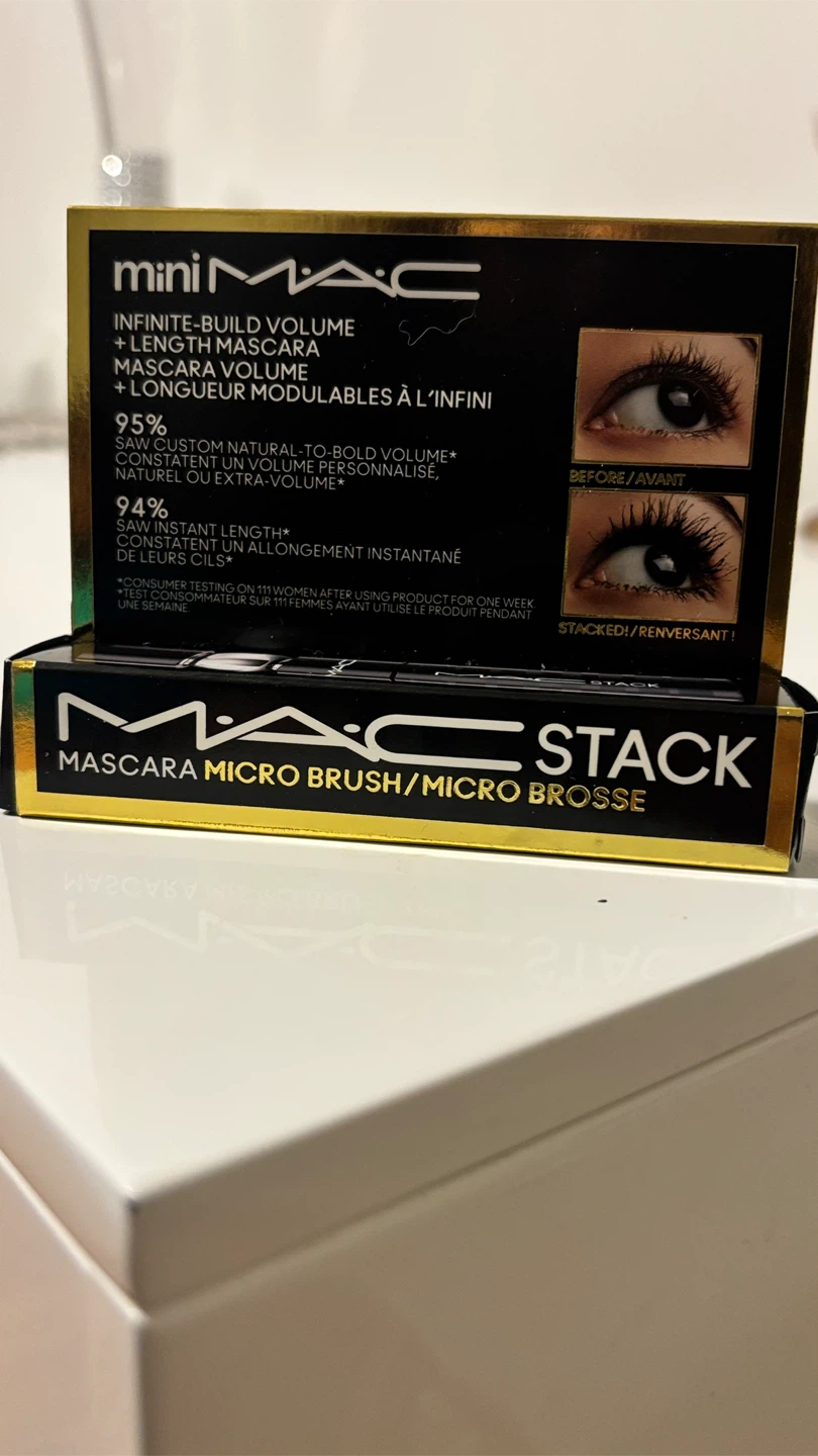 New MAC Stack mascara. Infinite-build volume and length. Superstack micro brush for ultra-precise application. 95% custom natural-to-bold volume. 94% instant length.8 ml