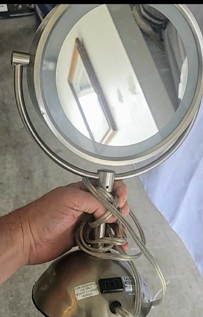 Silver-toned vanity mirror with LED lighting. Features a swivel arm and a weighted base. Plug-in design. one side is concave for close up section of face.
