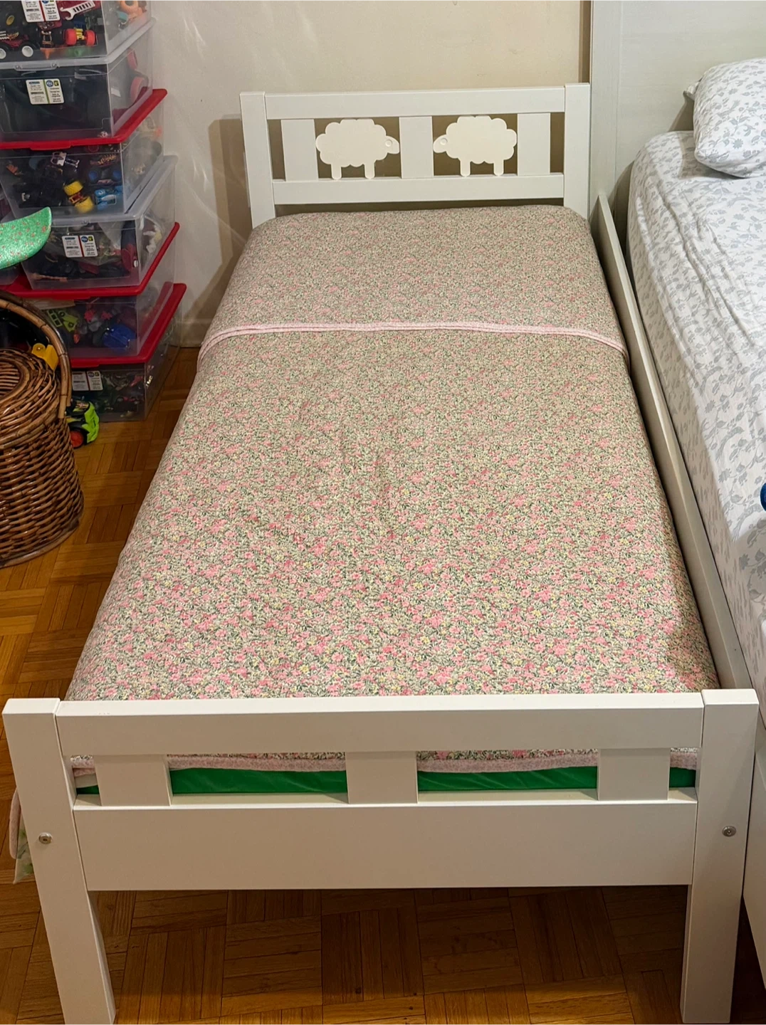 This is an IKEA KRITTER bed frame in white. It's a great size for a child's first bed. The bed frame dimensions are 70x160 cm.