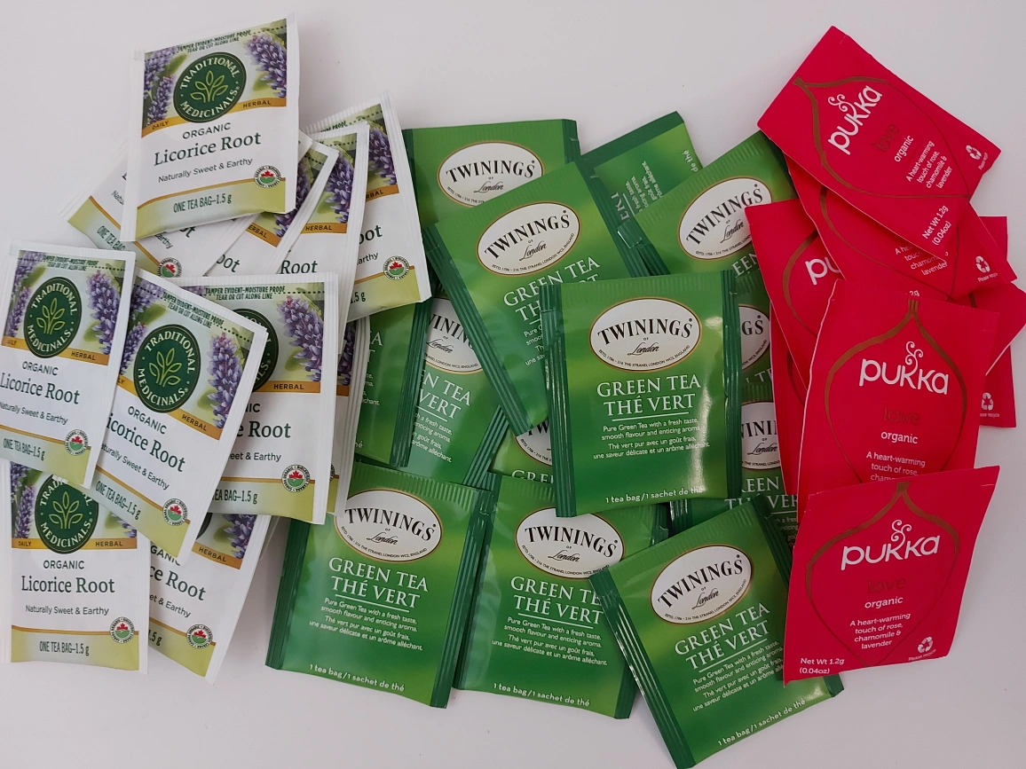 Individually wrapped tea bags. A mix of Twining's Green Tea, Pukka Love and Traditional Medicinals Licorice Tea. I don't reach for these teas anymore. Please see the expiry dates in the last three photos. Offering them to a tea drinker who would enjoy them.