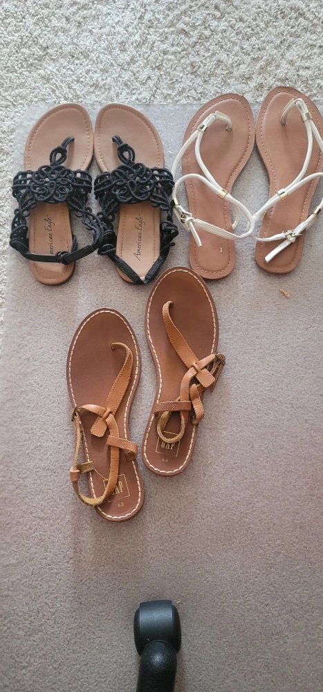 Bundle of 3 pairs of women's sandals. A pair of black sandals with woven detailing, one pair of white sandals with thin straps, and one pair of brown leather-look sandals. $10 each