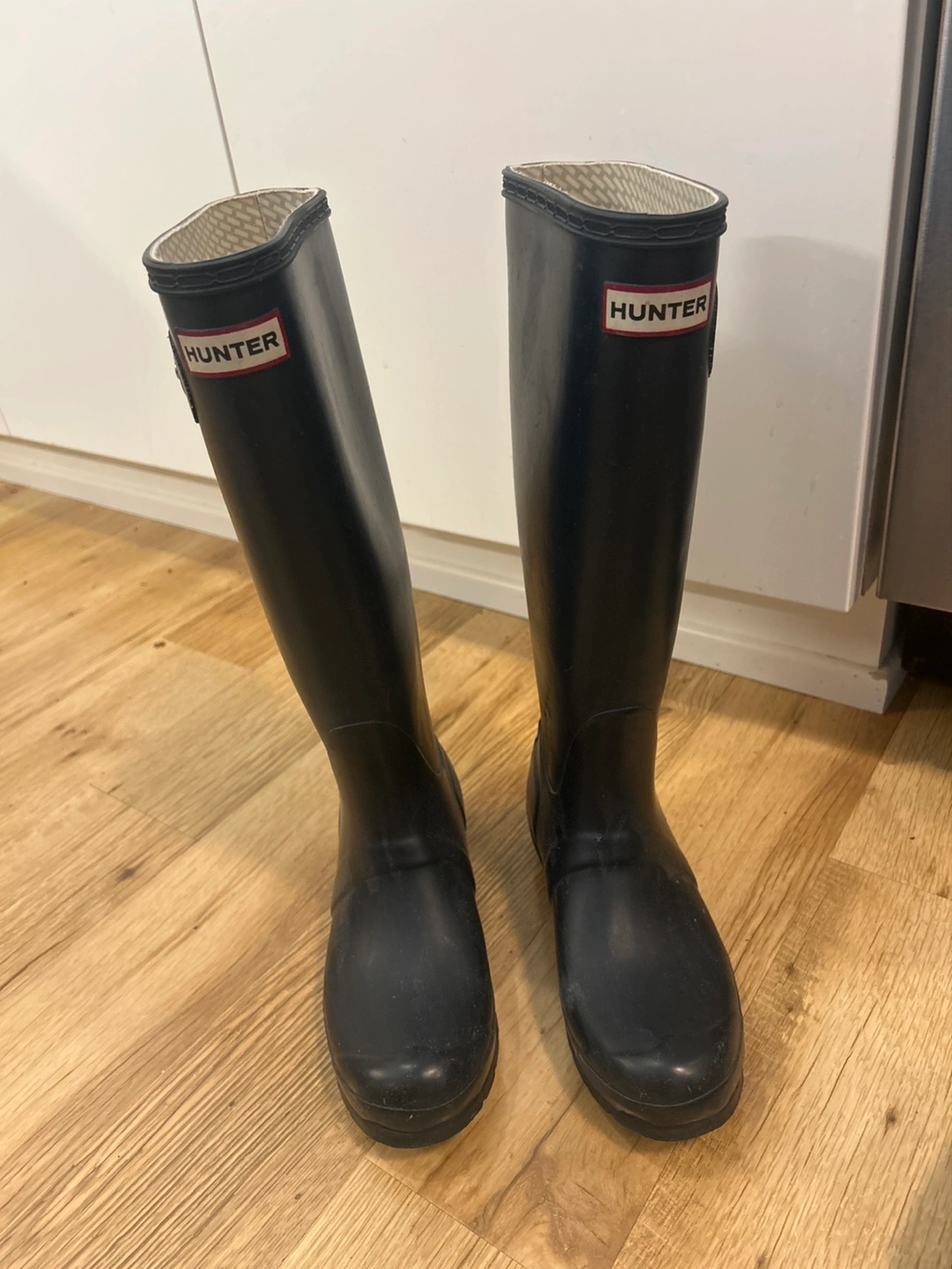 Hunter rain boots. Tall shaft. Good for rainy weather. Classic style.