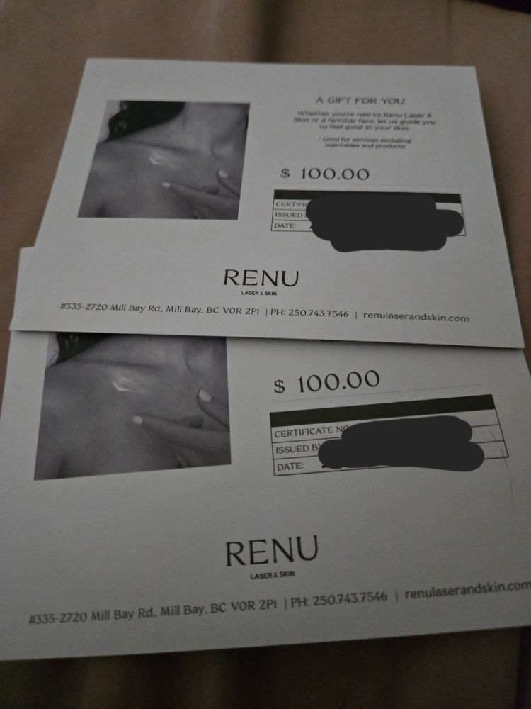 Two $100 gift certificates. Valid for services at Renu Laser & Skin. $200 total value makes great Christmas gift