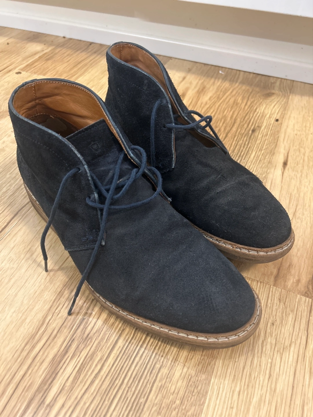 133Pair of navy suede chukka boots. Lace-up closure. Brown leather interior. Cream coloured sole.