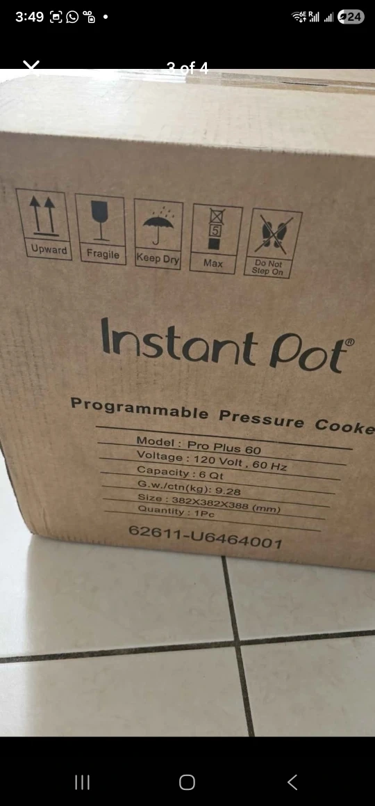 instsnt Pot - Programmable pressure cooker, model Pro Plus 60. It's 6 Qt capacity and 120 Volt, 60 Hz. G.W./(kg): 9.28. Includes original box.- Brand new