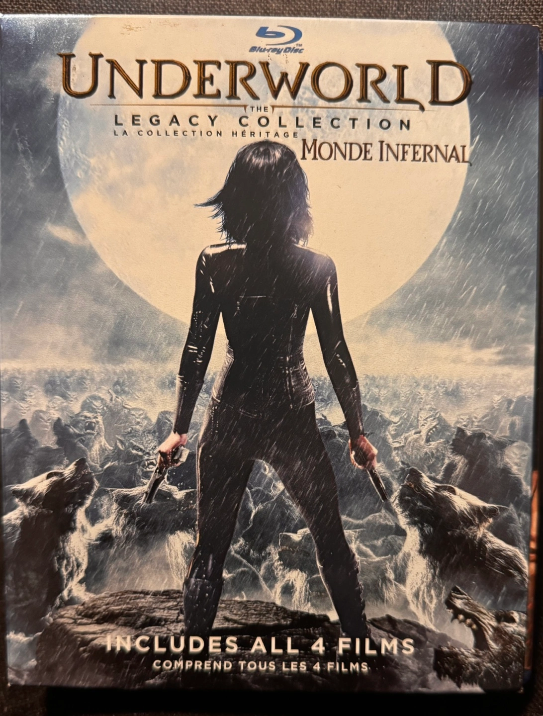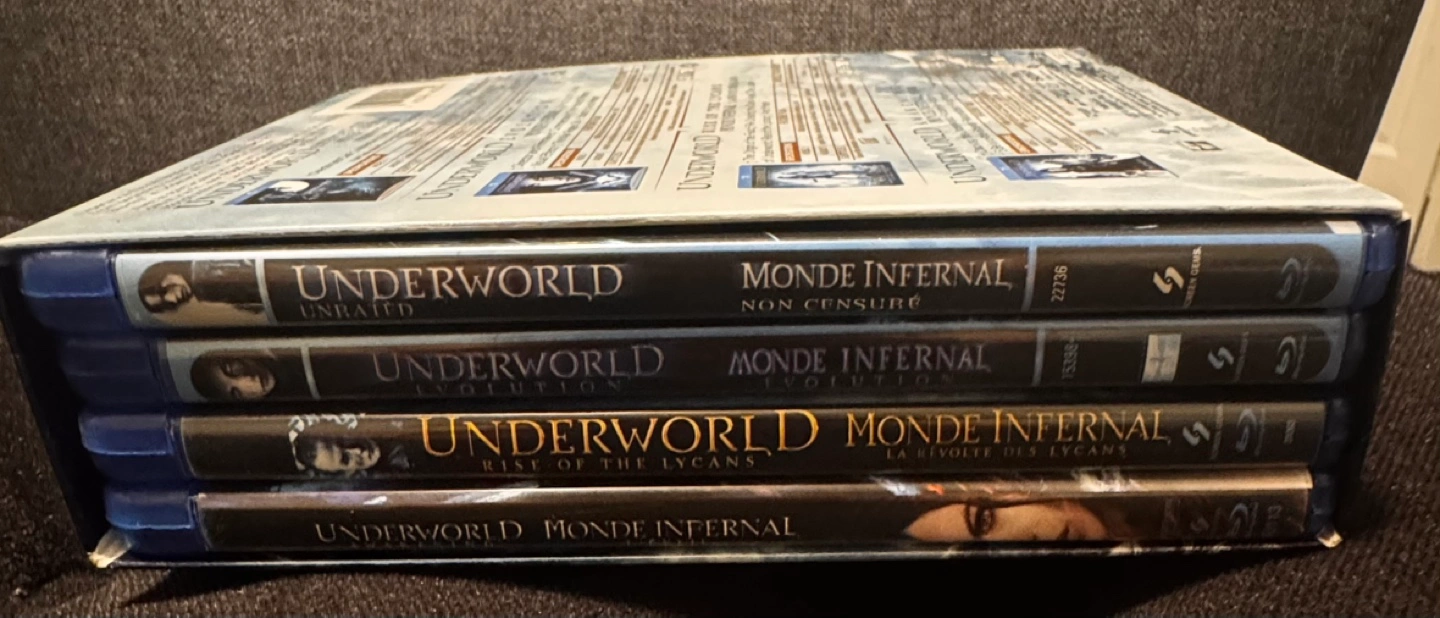 Complete 4-film Blu-ray collection. Includes Underworld, Underworld Evolution, Underworld: Rise of the Lycans, and Underworld Awakening. All four films in one box set. French and English audio options.