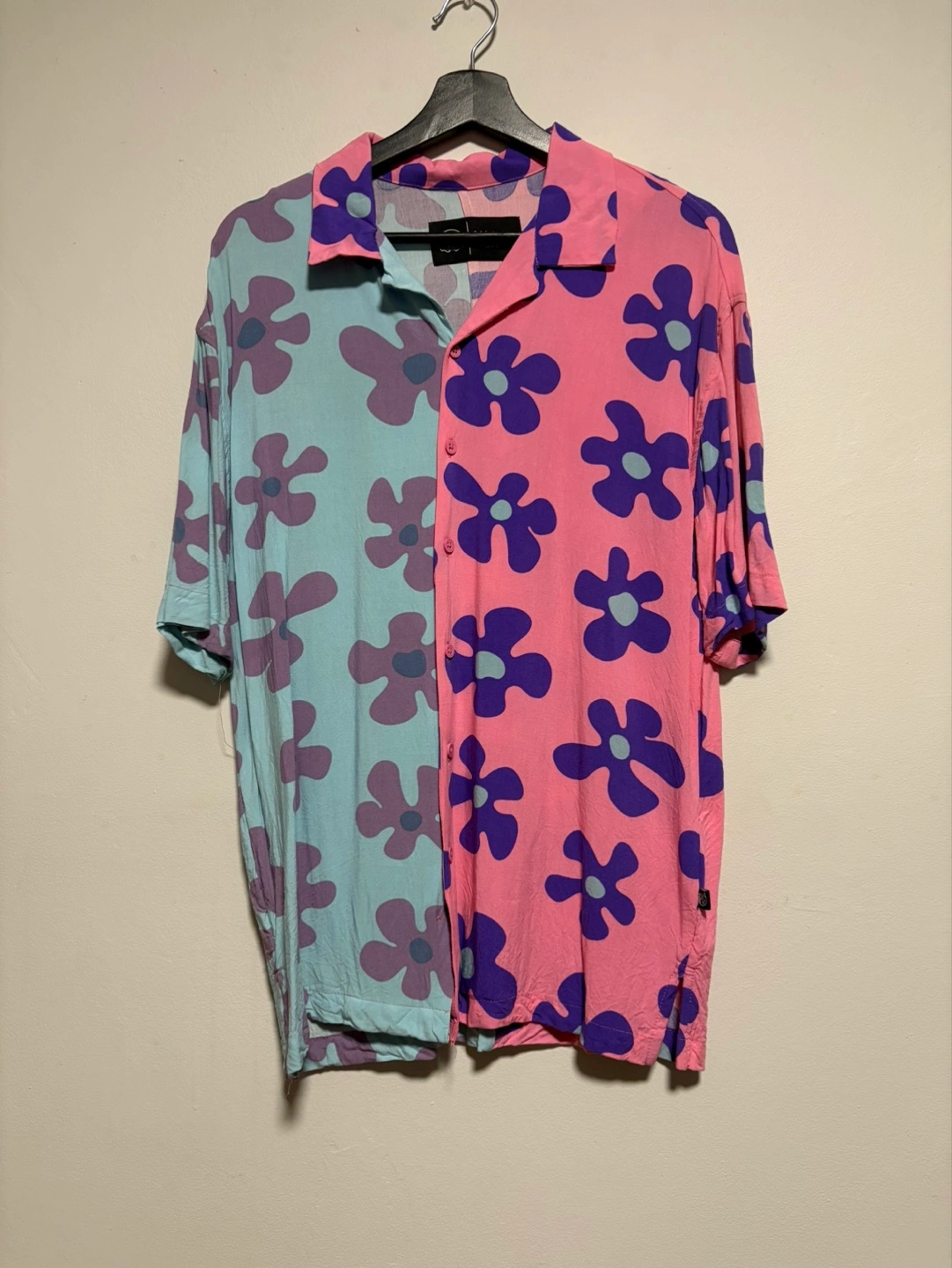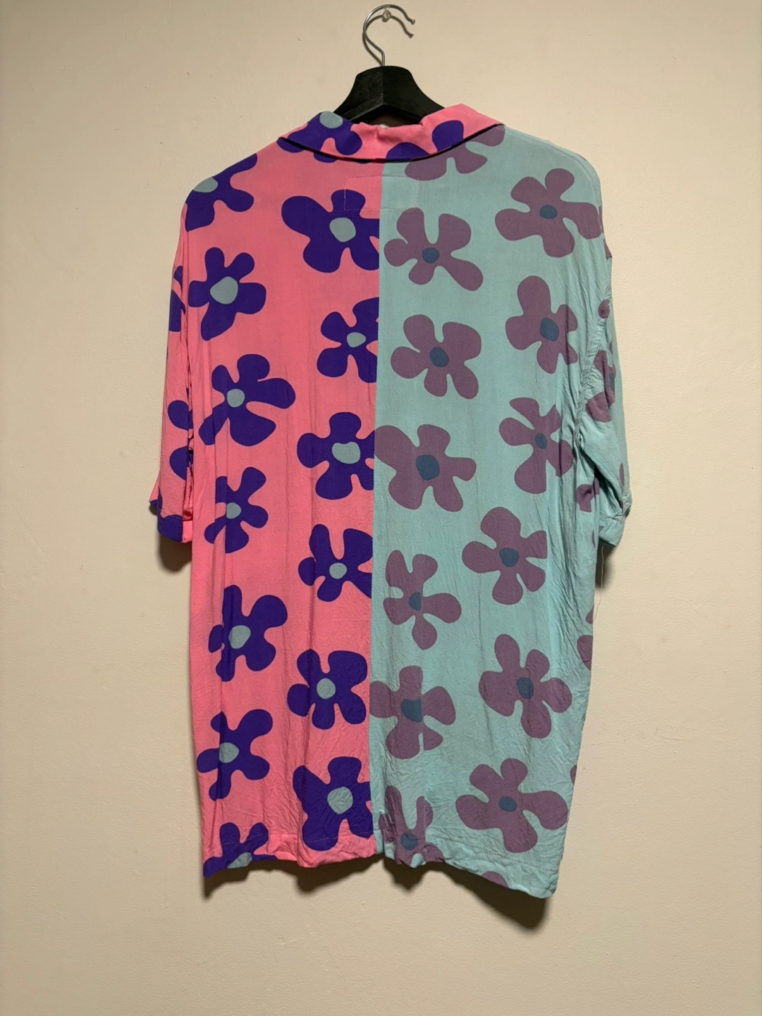 Men's short-sleeve button-up shirt. Pink and teal colour-block design. Floral pattern. Relaxed fit.
