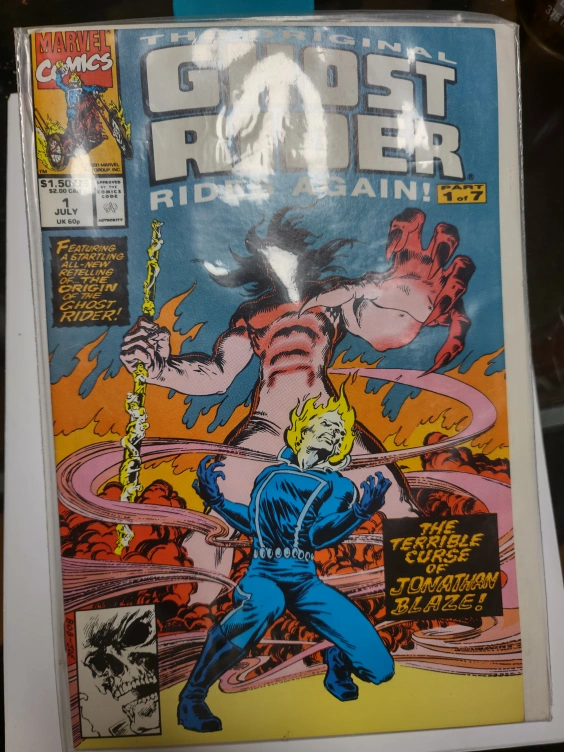 Vintage Marvel Comics Ghost Rider issue #1. Part 1 of 7. July 1990. Features a startling all-new retelling of the origin of Ghost Rider. The terrible curse of Jonathan Blaze!