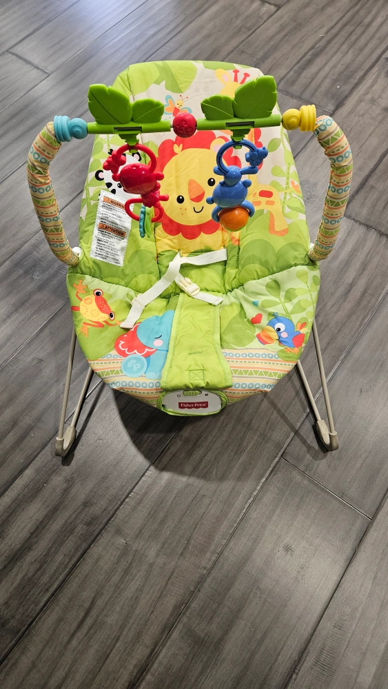 15Infant bouncer. Features a jungle theme with multiple hanging toys. Vibrant colours and playful design.