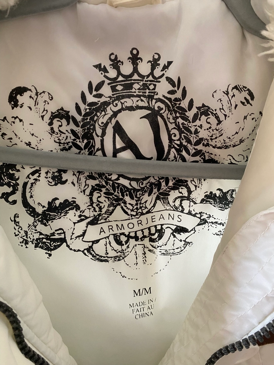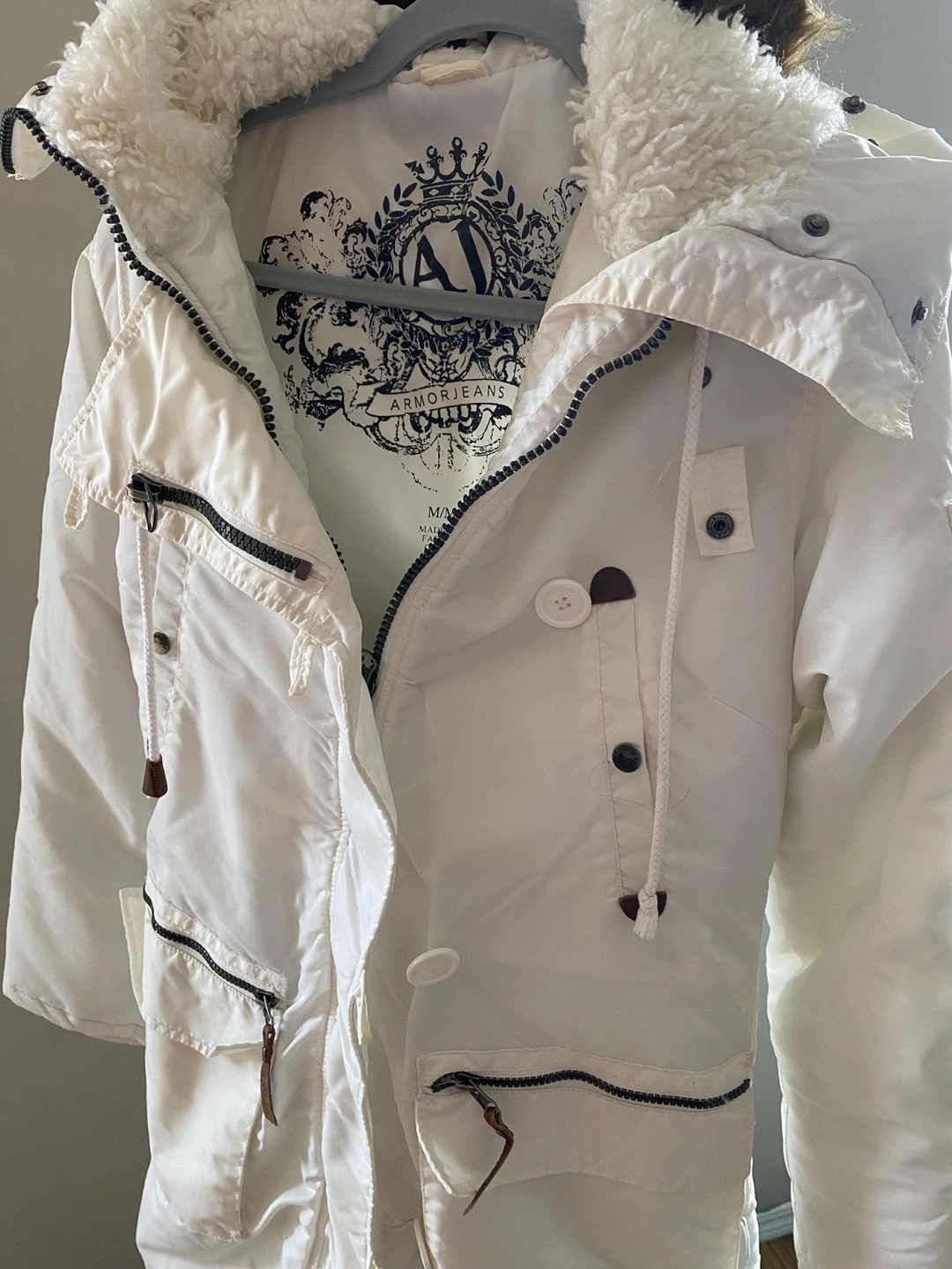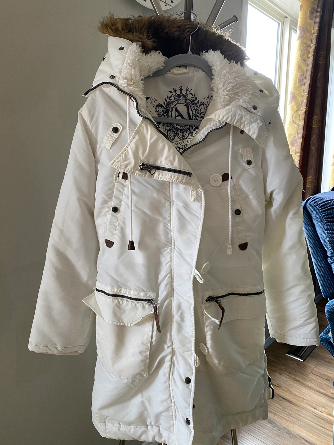 Women's white parka. Features a faux fur trimmed hood, sherpa lining around the hood, and multiple pockets. Size Medium.