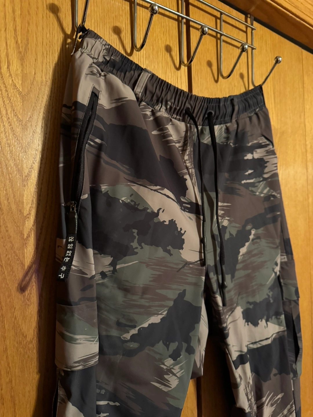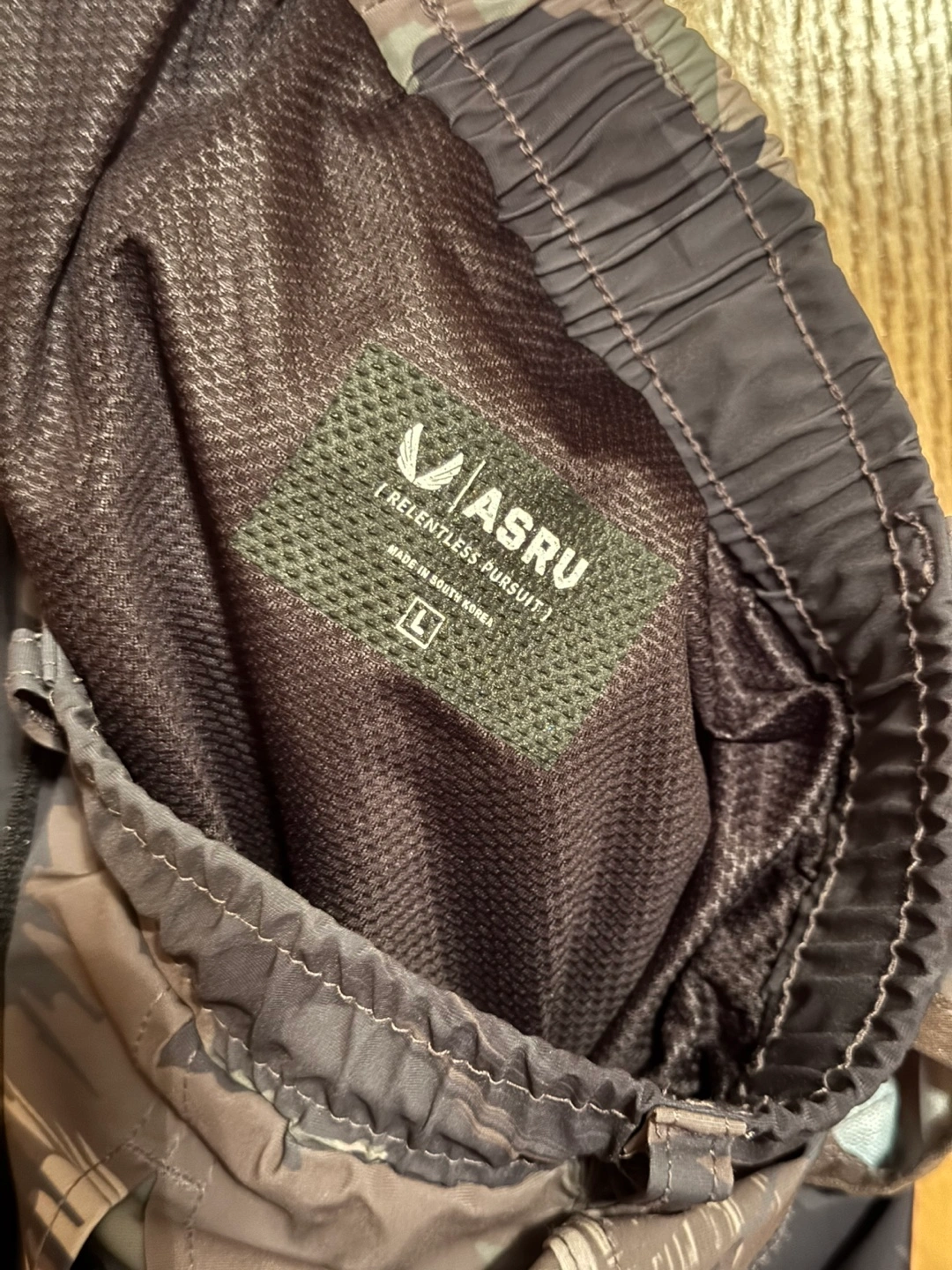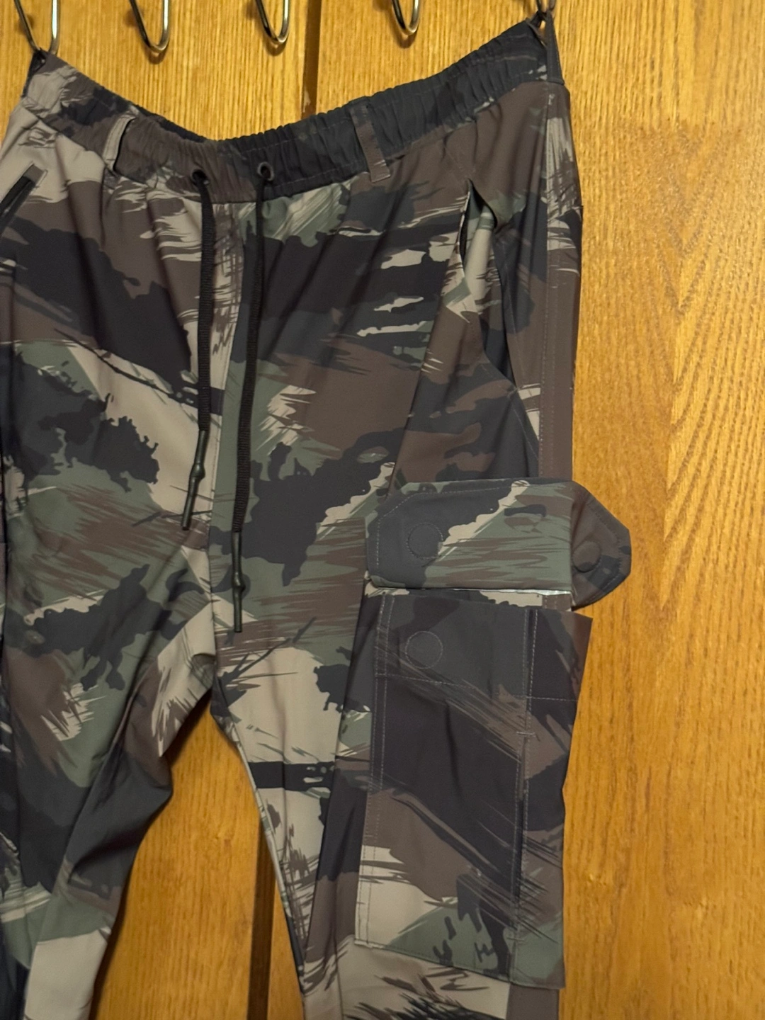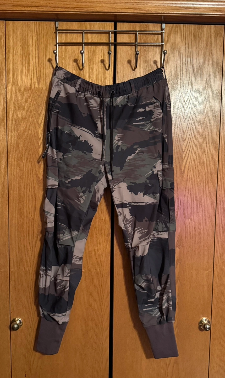 Men's ASRU Tetra cargo pants. Camo print. Drawstring waist. Side zip pockets. Multiple cargo pockets with magnetic closure.Elastic cuffs.