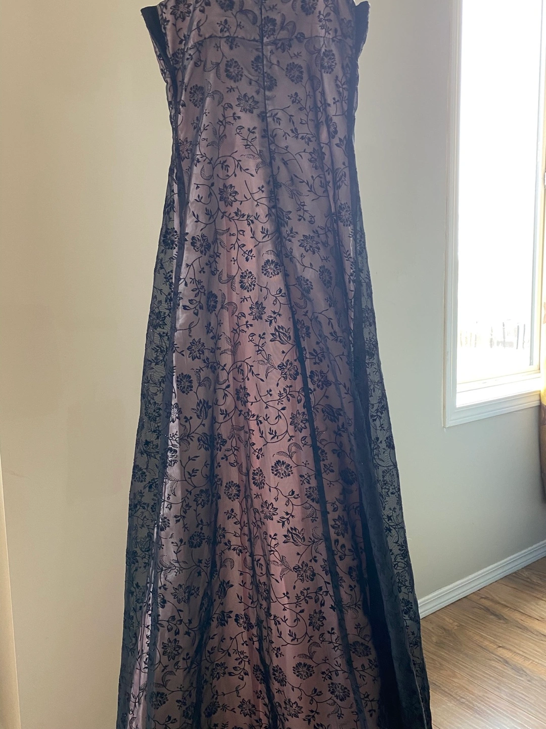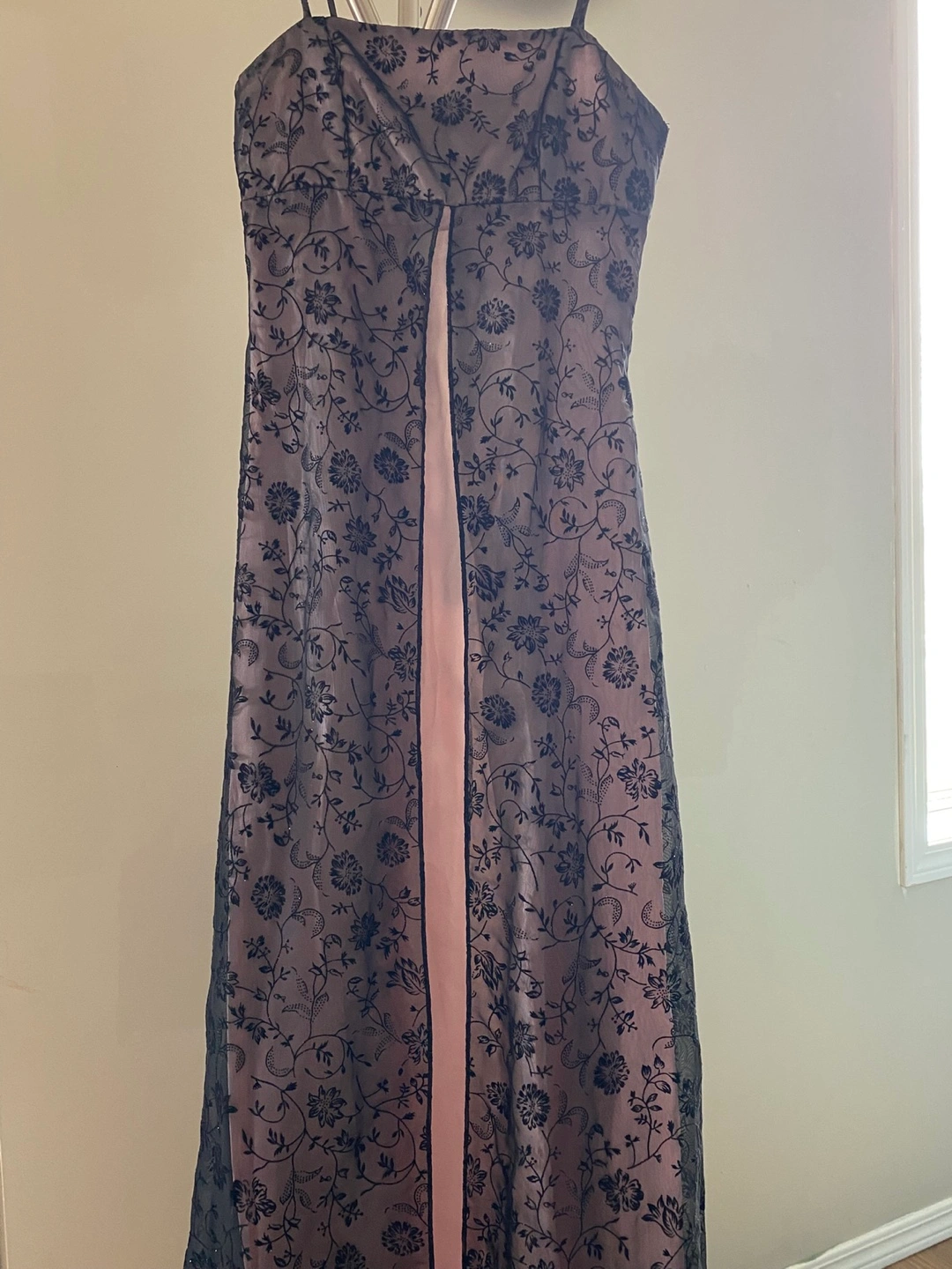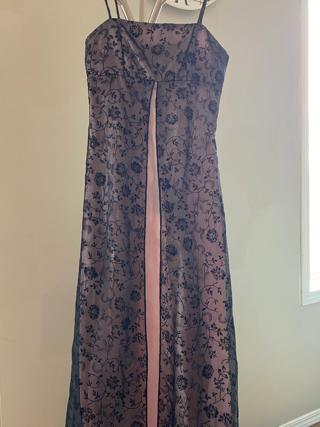 Beautiful formal gown. Features a black floral pattern on a mauve-pink underlay. Long and elegant. Spaghetti straps.