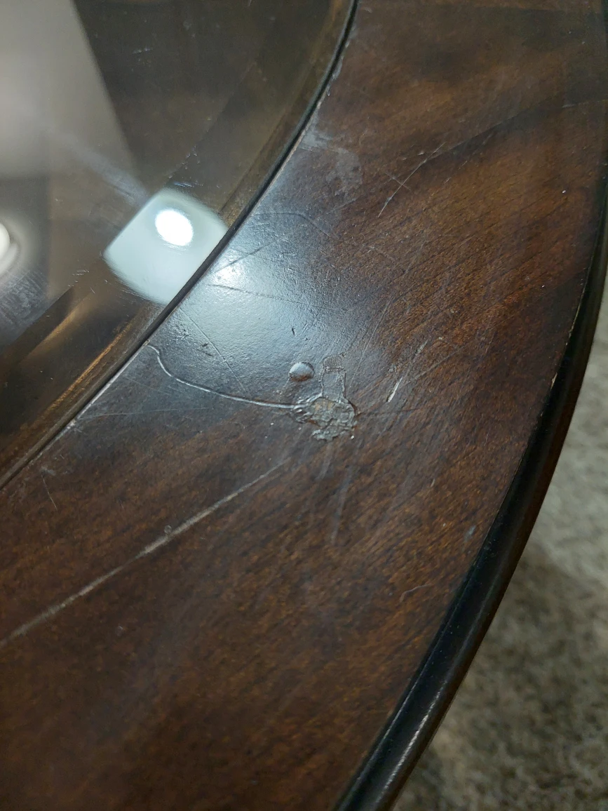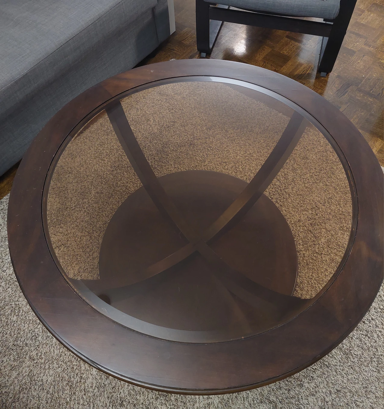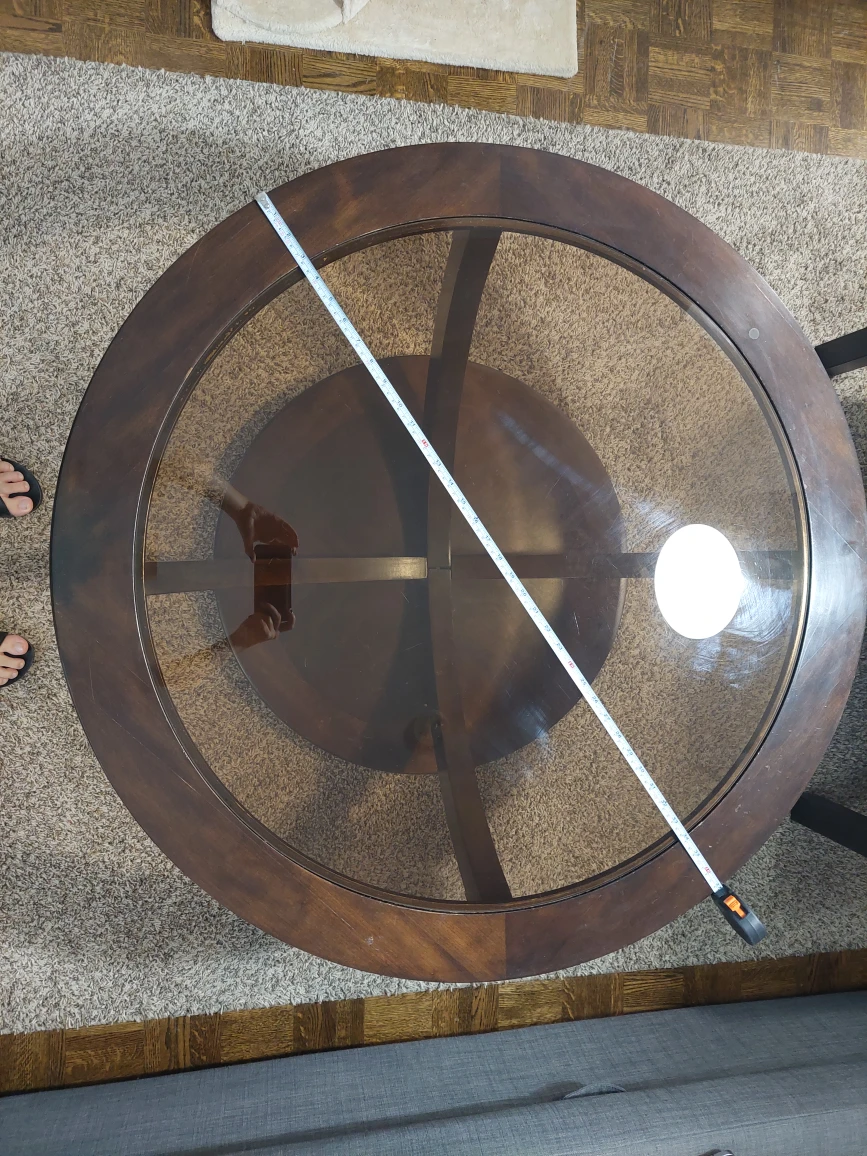 Round coffee table, very sturdy.