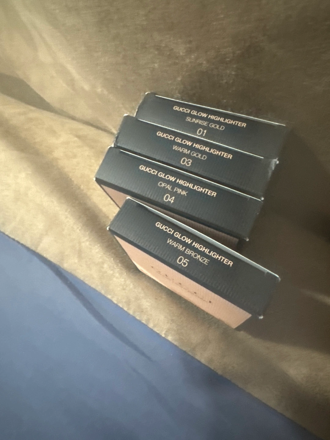 Four Gucci Glow Highlighters. Shades include Sunrise Gold, Warm Gold, Opal Pink, and Warm Bronze. Multi-use silky illuminating powder. Each 0.35 oz.