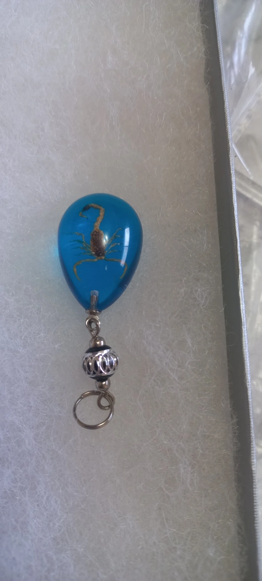 Unique teal resin pendant. Features a preserved scorpion. Silver-toned metal accents. Perfect addition to jewellery collection.