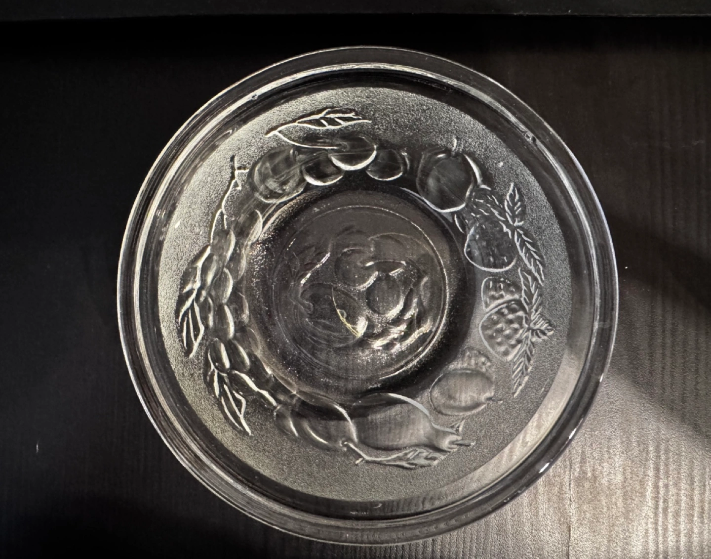 Three thick glass bowls. Clear glass with etched fruit design. Small size, perfect for dessert or individual servings.