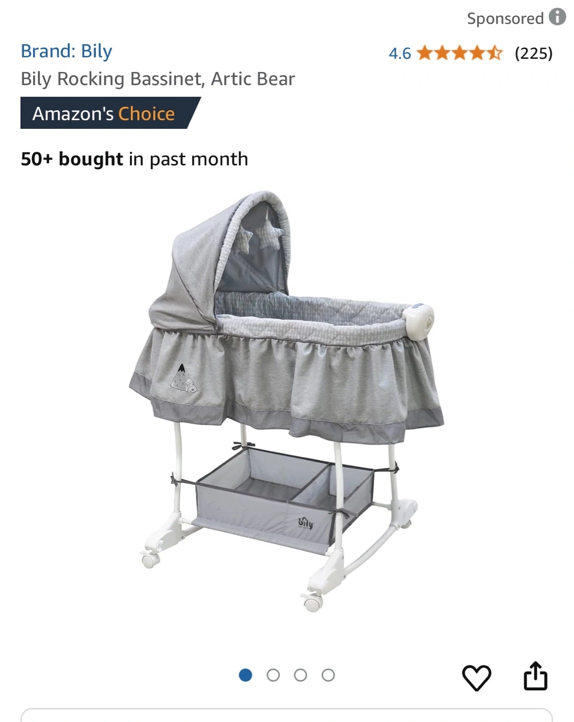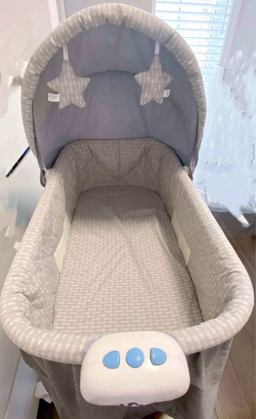 Grey rocking bassinet with storage. Features wheels, a canopy that really helped with blocking lights for baby’s snap and a handy storage underneath. Please note that buttons do not work (reflected in the price) but is in an excellent condition as a bassinet.