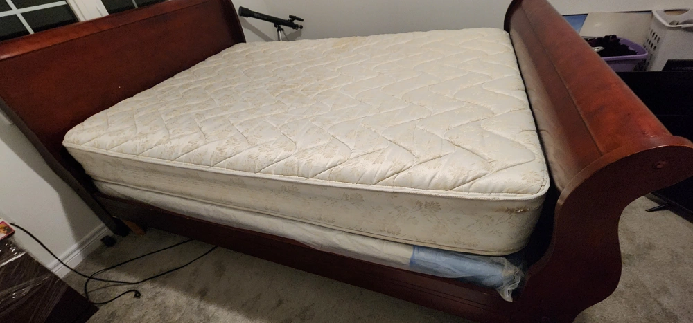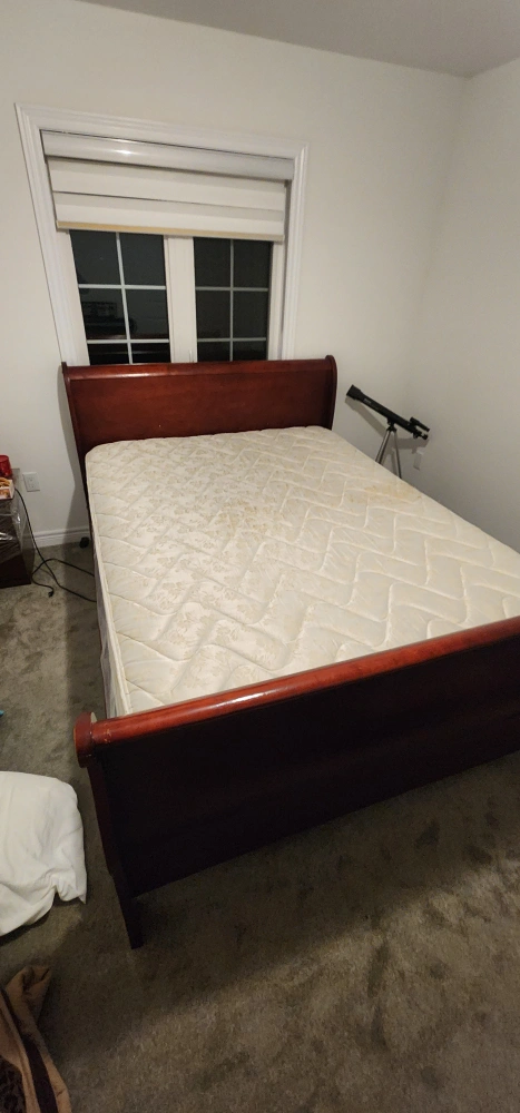 Double sleigh bed frame, dark reddish-brown wood. Includes mattress. Some stains on mattress. needs to go asap. whole thing for $50 bed, mattress and spring